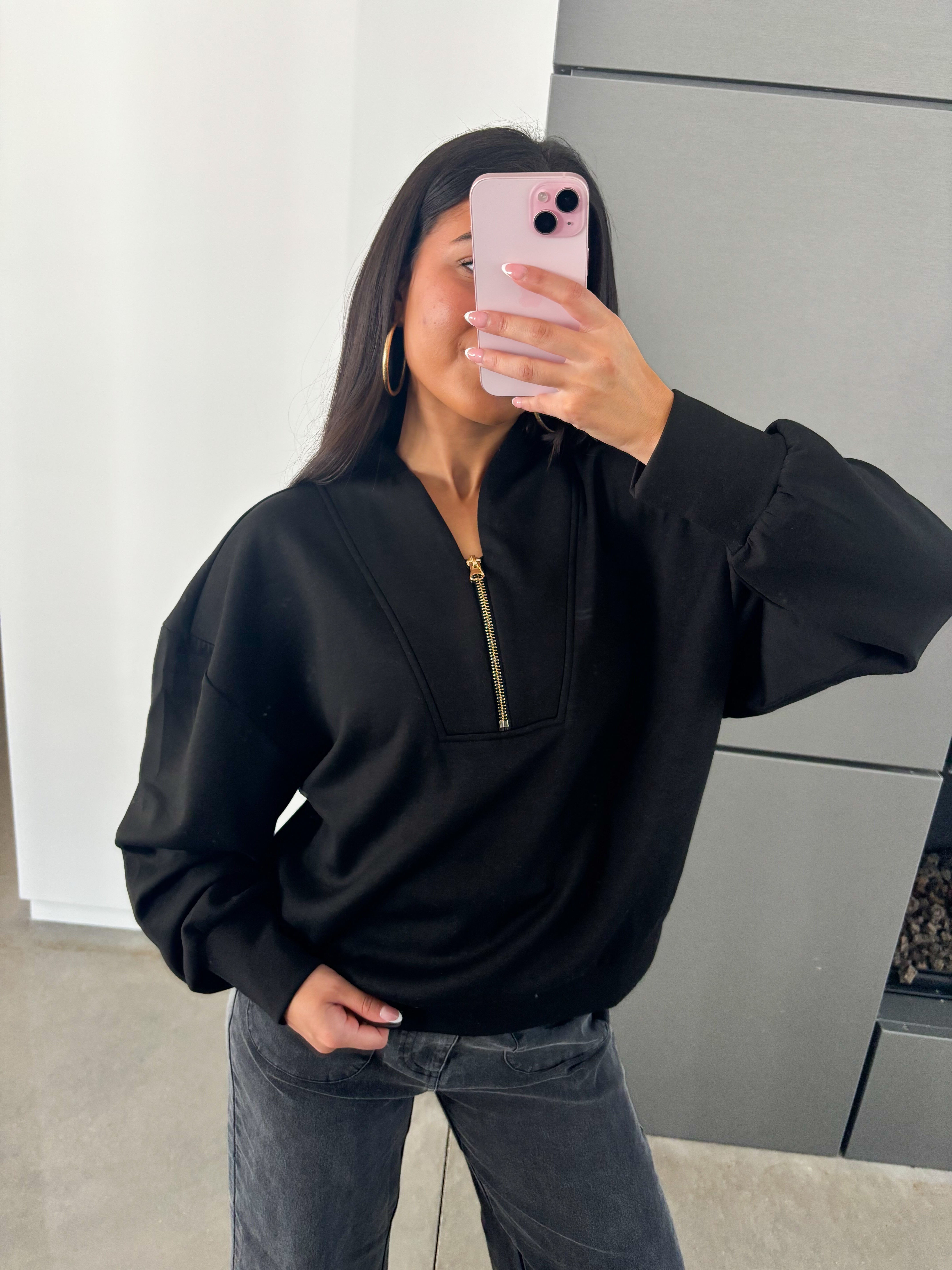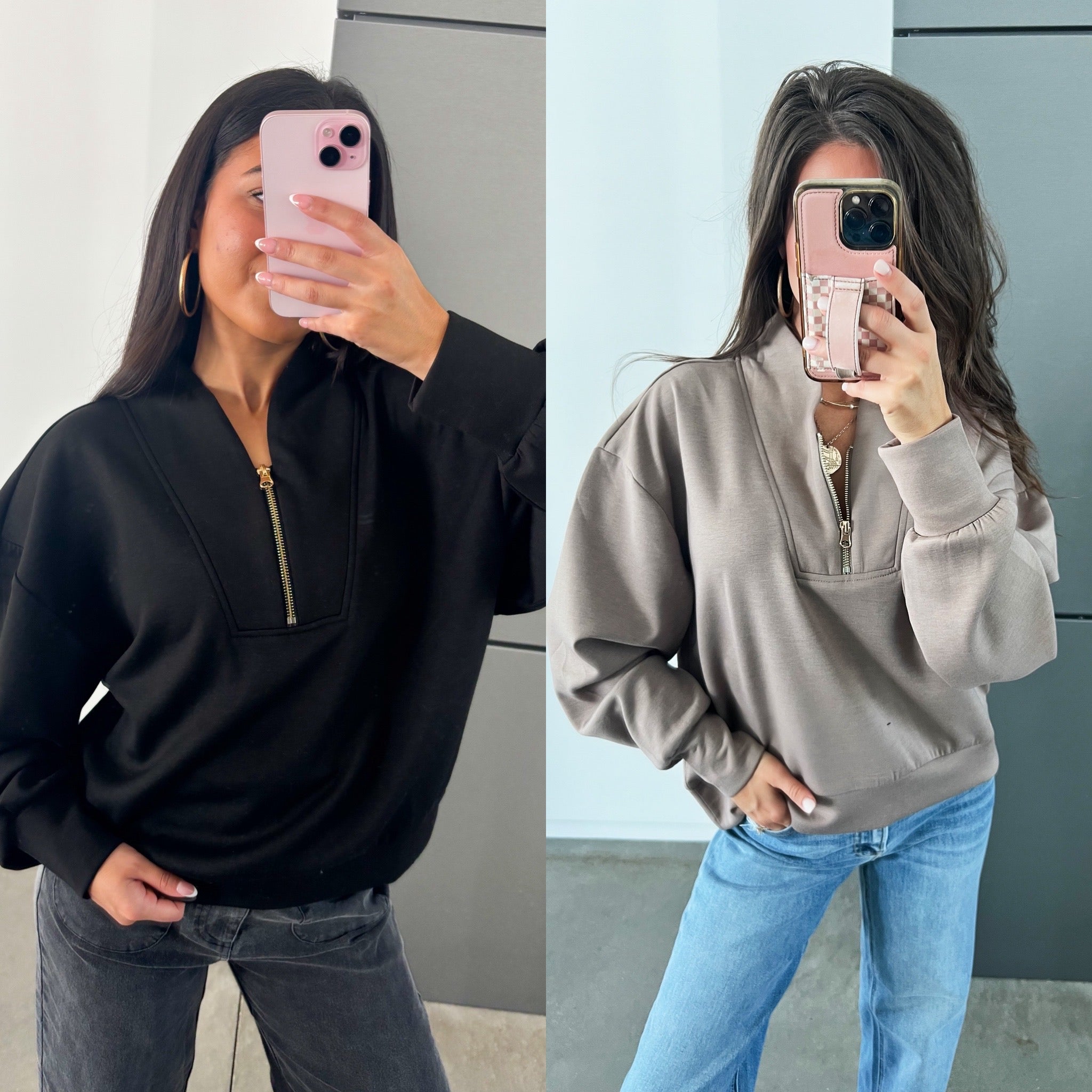 Chic Comfort Scuba Zip Pullover – Women’s Half-Zip Top in Cocoa & Black – Instyle Boutique