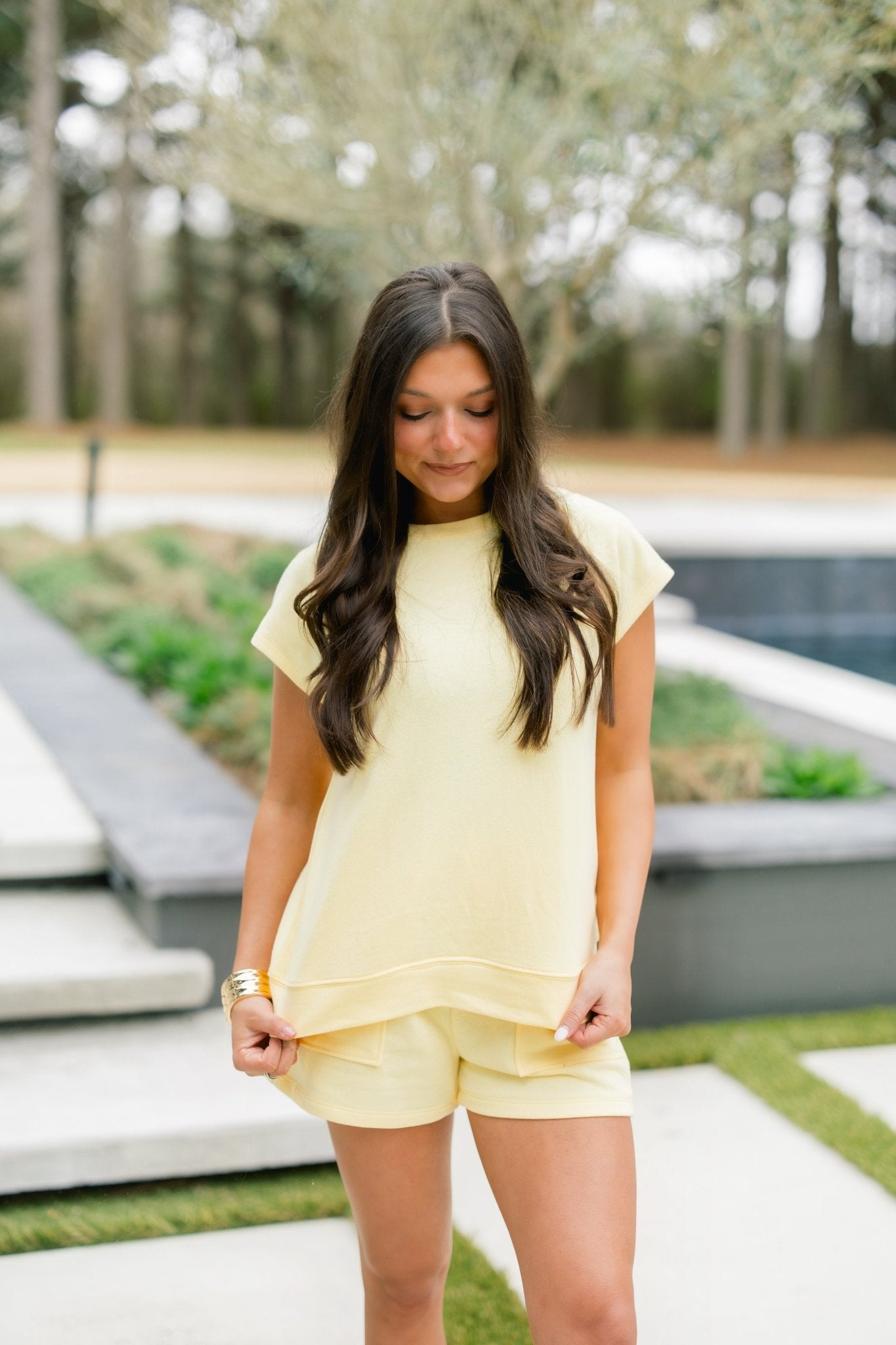 Easy, effortless, and made for everyday wear—the Core Comfort Set- Yellow is your new go-to for relaxed days and off-duty style! This two-piece set features a soft, breathable short-sleeve top paired with matching comfy shorts, all in a gorgeous yellow hue. The minimalist design keeps it timeless, while the cozy fabric makes it perfect for lounging, errands, or casual weekends. 54% Cotton, 46% Polyester.
