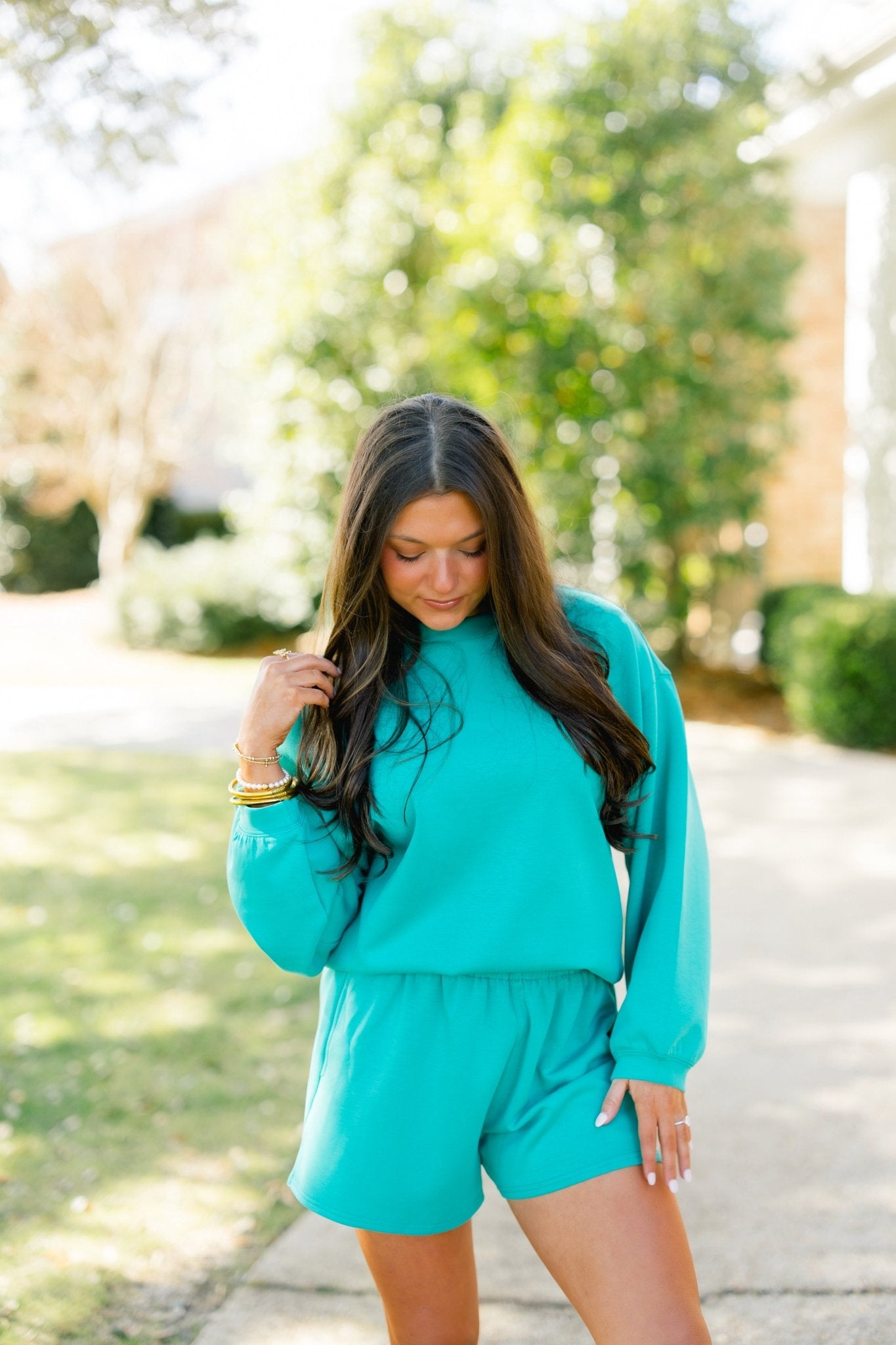 Meet your new go-to for effortless comfort with a polished feel—the Emerald Ease Long Sleeve Set is made for easy days that still call for style! This two-piece set features a relaxed long sleeve top paired with coordinating flowy shorts, all in a rich emerald green that feels fresh and elevated. 48% Modal, 48% Polyester, 4% Spandex.