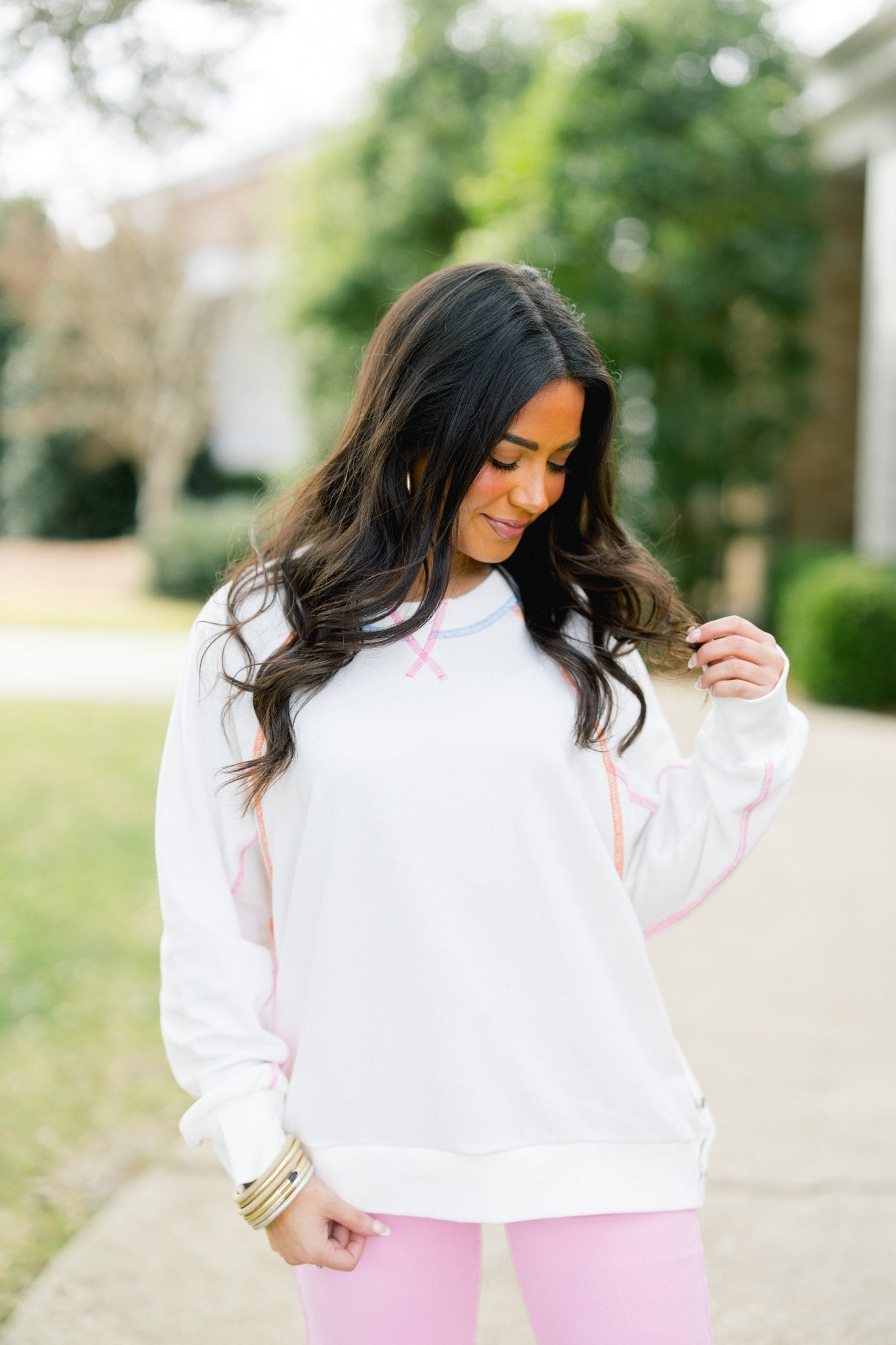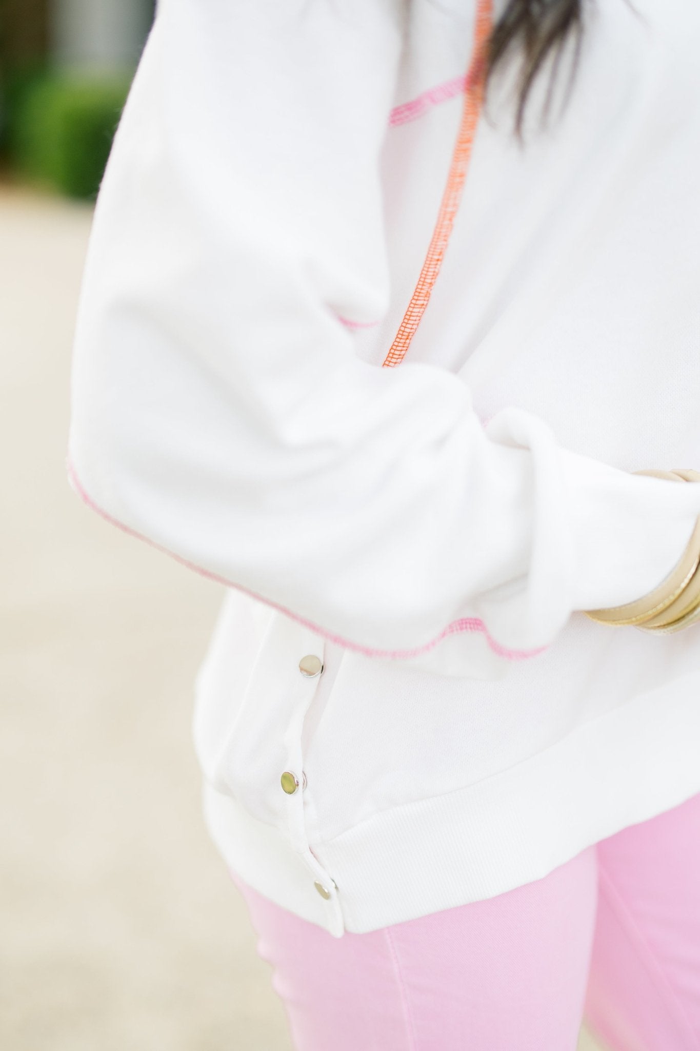 Elevate your essentials with this crisp white sweatshirt featuring vibrant, multi-color contrast stitching and artisan-inspired details. Designed with a relaxed raglan fit and trendy side-snap accents, it’s the ultimate fusion of cozy comfort and playful, modern style. Turn heads in a basic that is anything but ordinary. 100% Cotton.