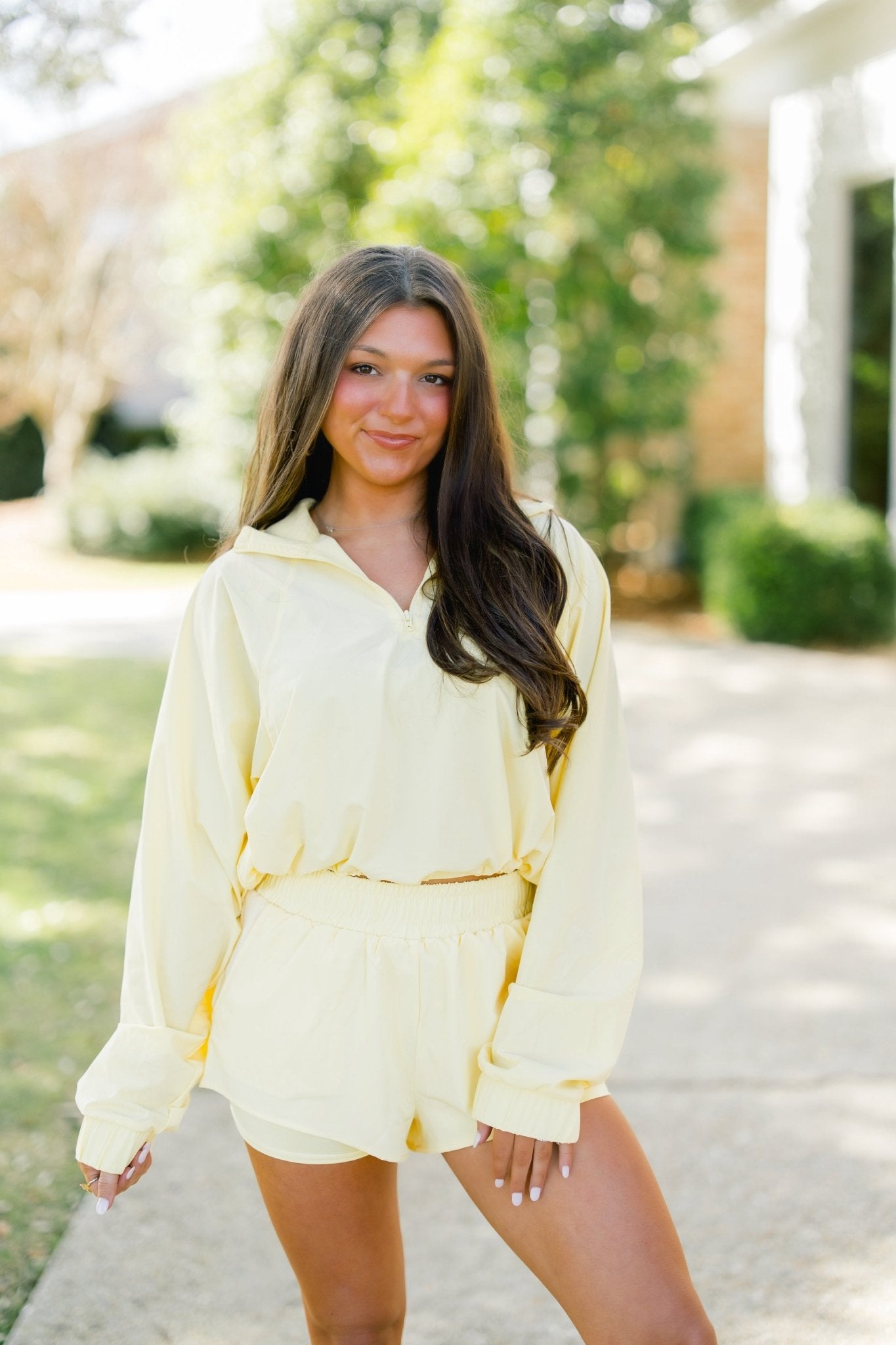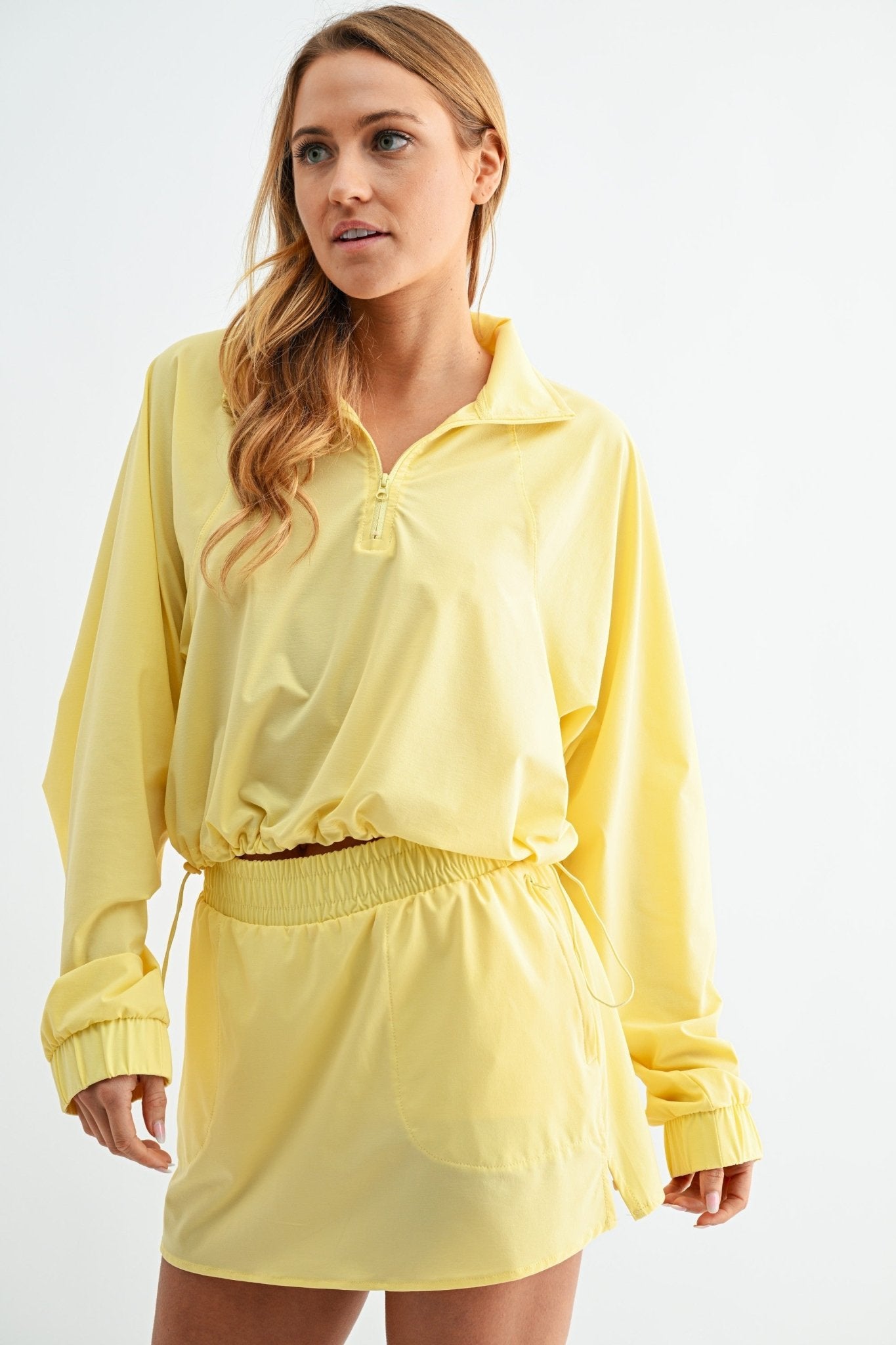 Brighten up your everyday look with the Yellow Glow Half Zip Pullover—the perfect mix of sporty, comfy, and cute! This lightweight pullover features a relaxed fit with a half-zip neckline, elastic cuffs, and a drawstring hem that lets you customize the shape for an easy, flattering silhouette. The sunny yellow hue adds a cheerful pop to your athleisure lineup, while the soft, smooth fabric keeps it comfortable enough for all-day wear. Pair it with the matching skirt or shorts for a coordinated set, or style it with leggings or denim for an effortless off-duty vibe! 88% Nylon, 12% Spandex.