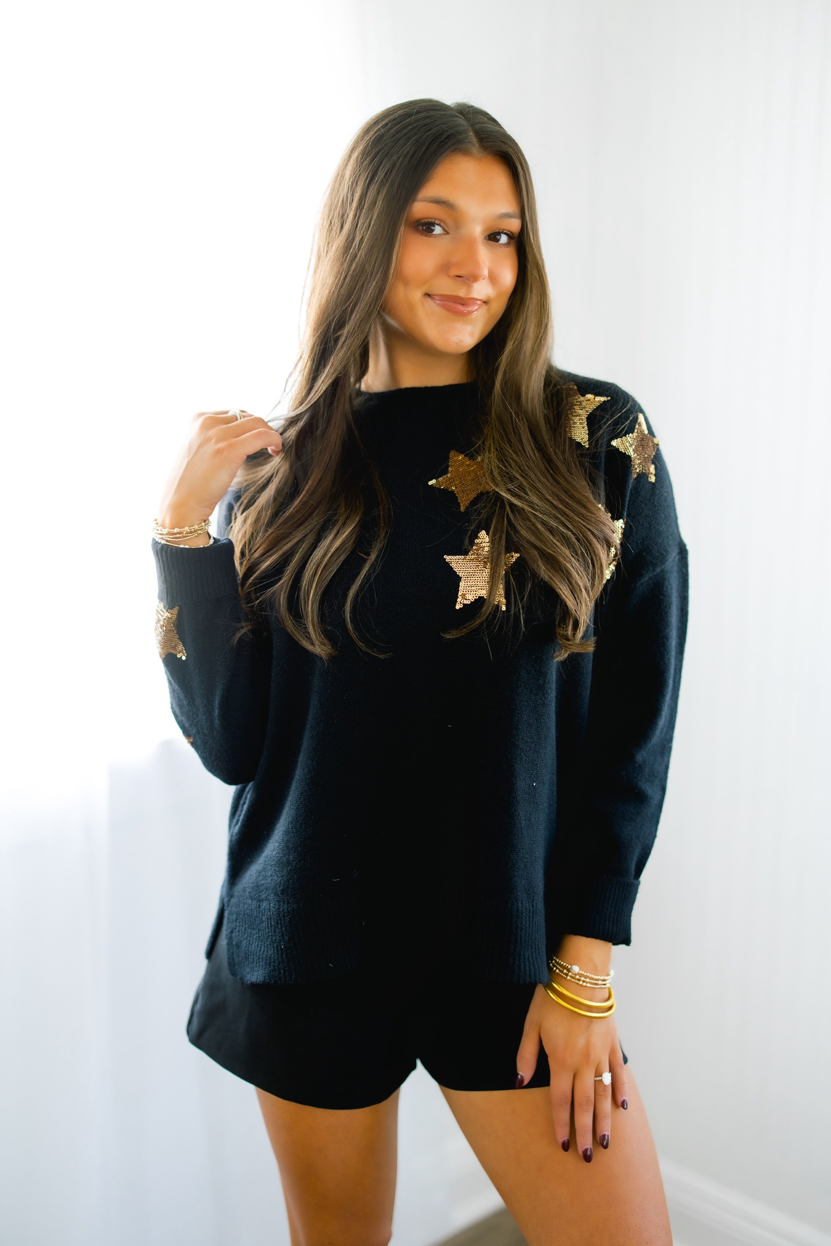 Add a little sparkle to your everyday look with the Stars Shine For You Black Sweater. Featuring dazzling gold sequin stars scattered across the shoulder, this cozy knit blends chic comfort with a touch of glam. The soft black fabric makes it versatile for pairing with denim, skirts, or leggings, while the star embellishments give it that eye-catching holiday-ready finish. 42% Acrylic, 30% Polyester, 28% Nylon.