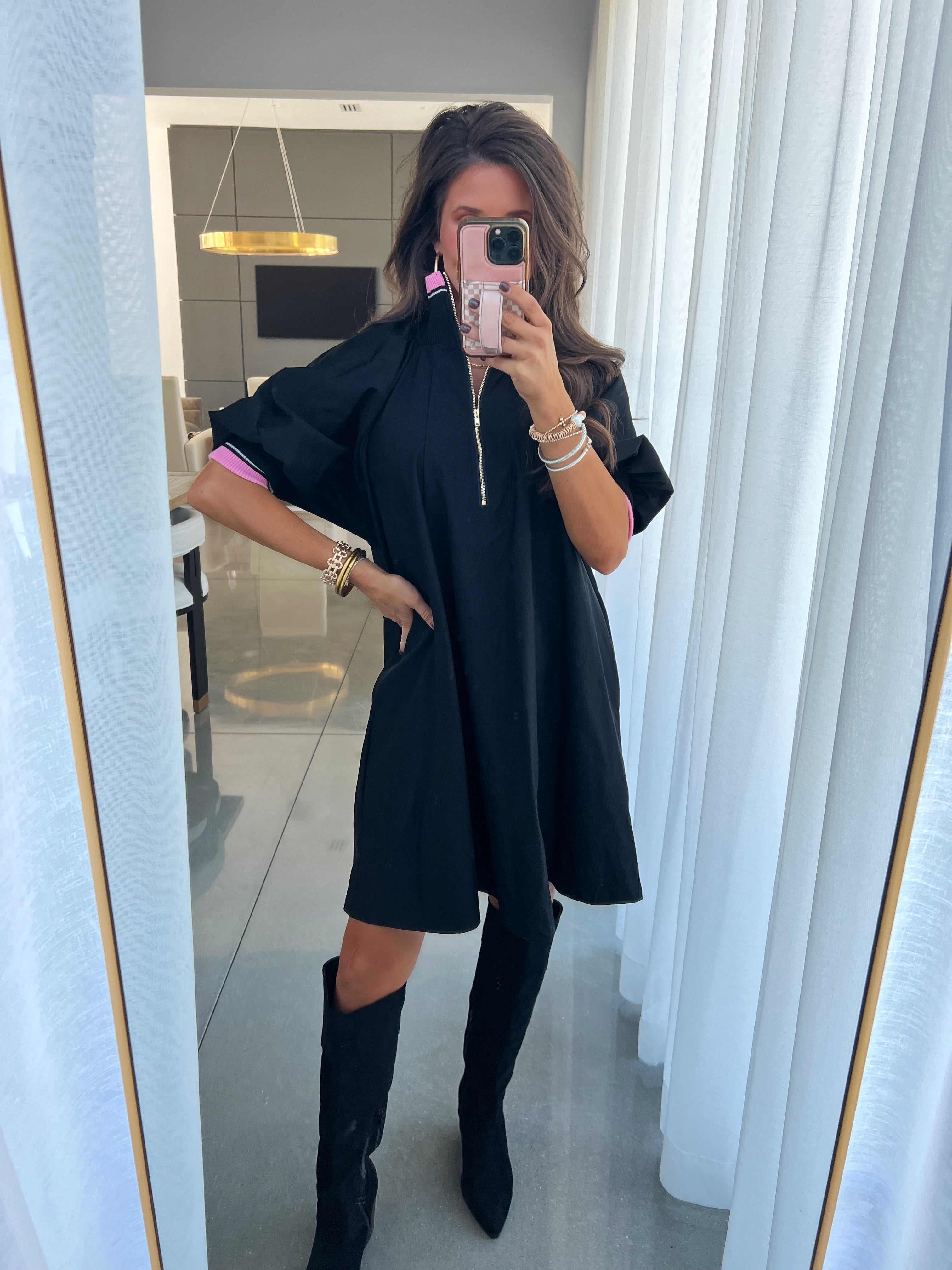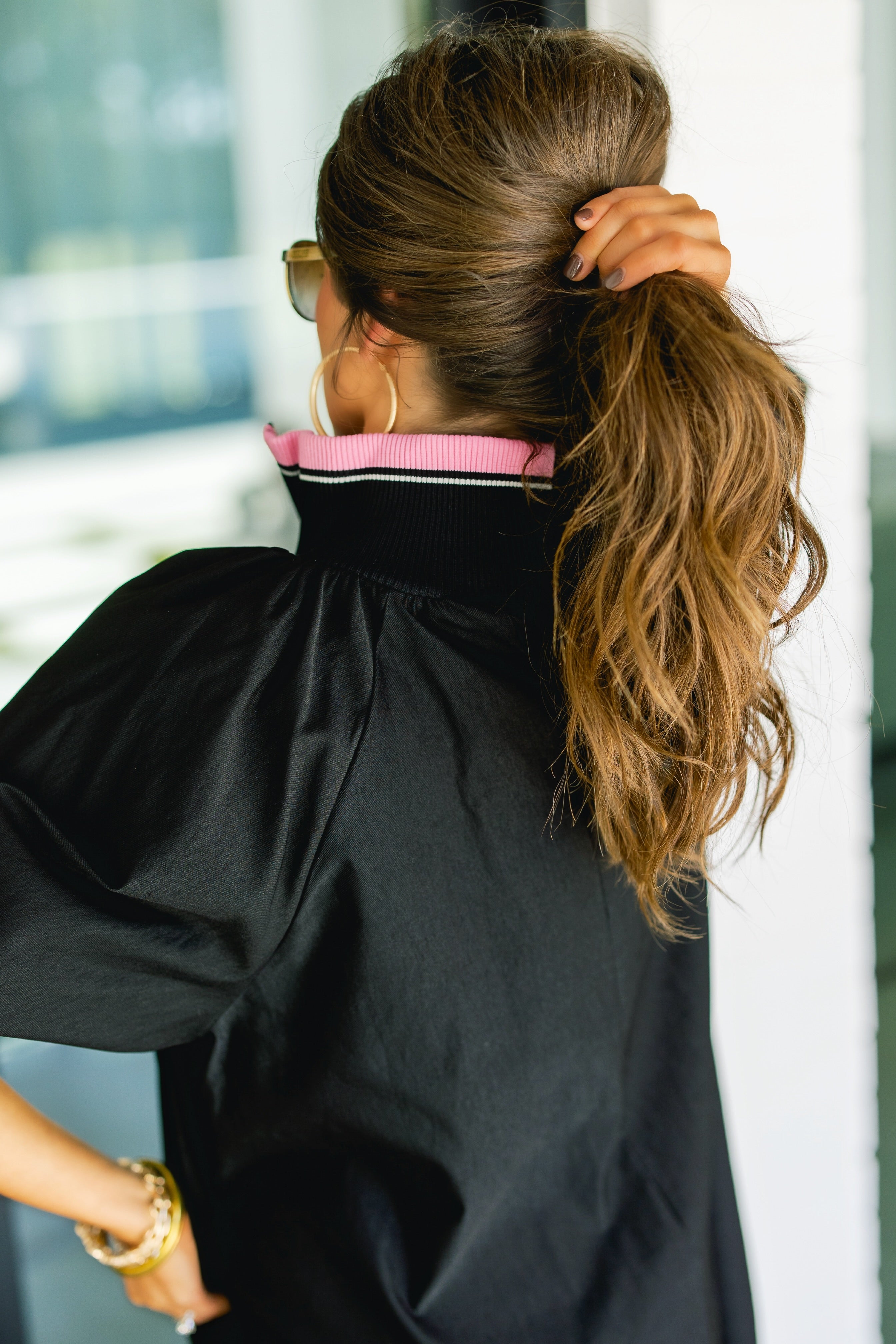 Bold, fun, and fashion-forward — the Bring It Back in Black Dress is the statement piece your wardrobe’s been waiting for. Designed with puff sleeves and a gold half-zip neckline, this dress combines sporty edge with feminine flair. The ribbed collar and cuffs feature a pop of pink for that perfect playful touch, making it ideal for both casual outings and chic nights out. 70% Rayon, 25% Chinlon, 5% Spandex