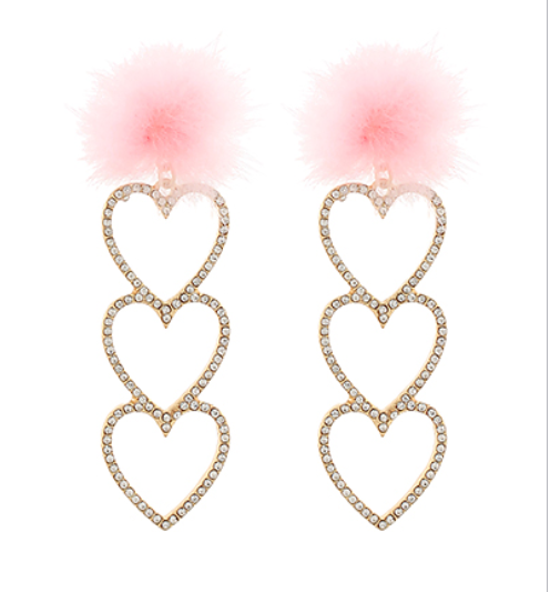 Add a fun pop of color with these Pink Pom Pom Heart Earrings. Featuring soft pink pom poms shaped like hearts, accented with sparkling rhinestones and touches of gold, they bring playful charm to any outfit. Lightweight and eye-catching, they’re perfect for brightening your day or making a statement at your next event.