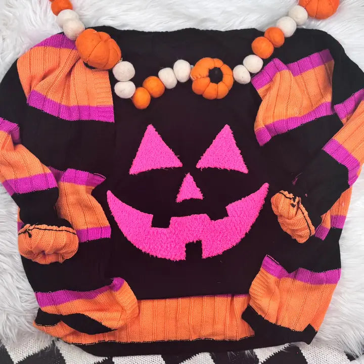 Light up your spooky season with the Jack-O-Lantern Neon Pink Fluffy Tee! Featuring a vibrant neon pink jack-o-lantern face on a bold black base with festive orange and purple striped sleeves, this tee is the ultimate mix of playful and cozy. The fluffy textured pumpkin design adds a fun pop, while the soft knit makes it perfect for fall days, Halloween parties, or casual wear with a festive flair. 100% Cotton