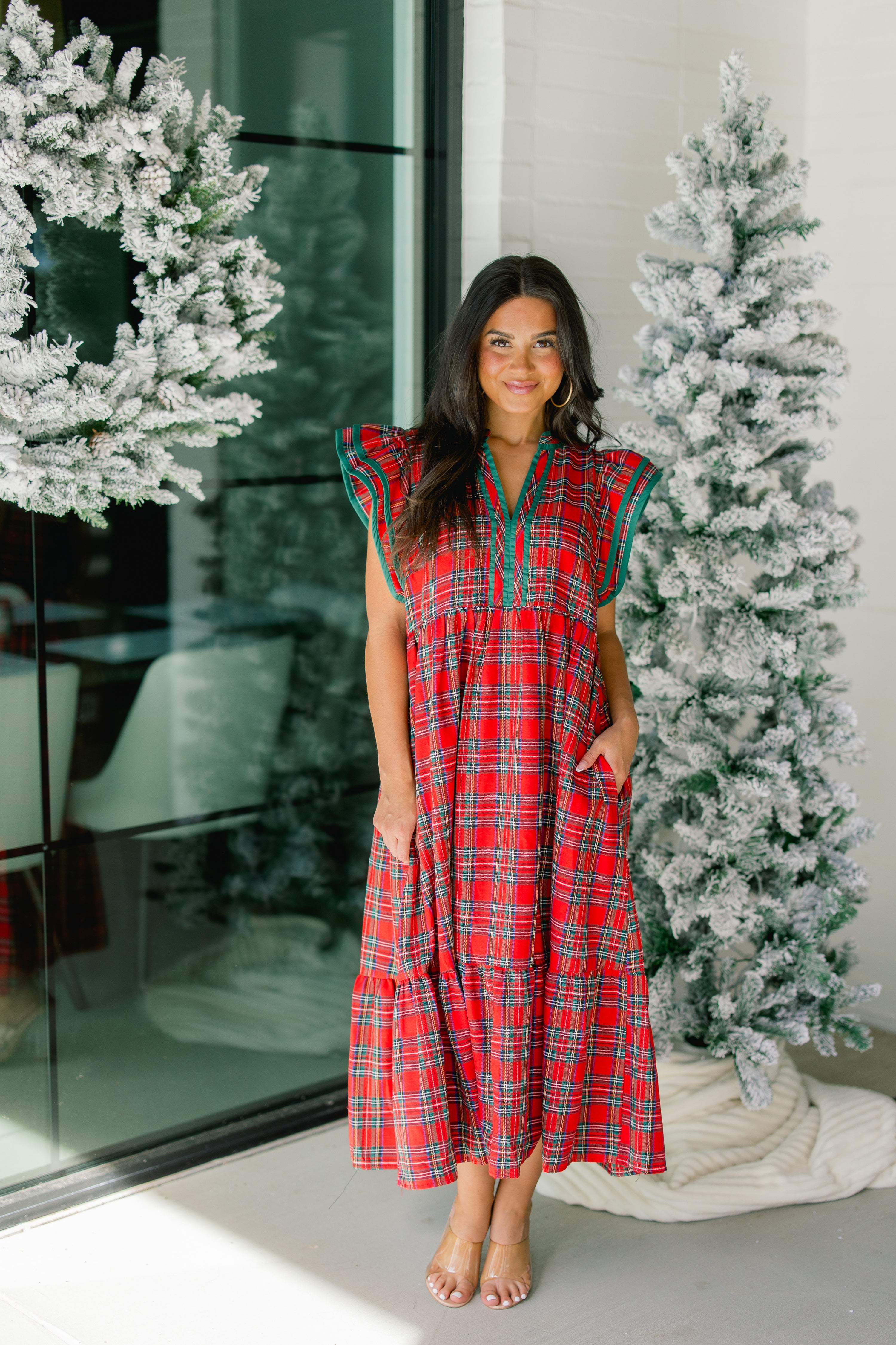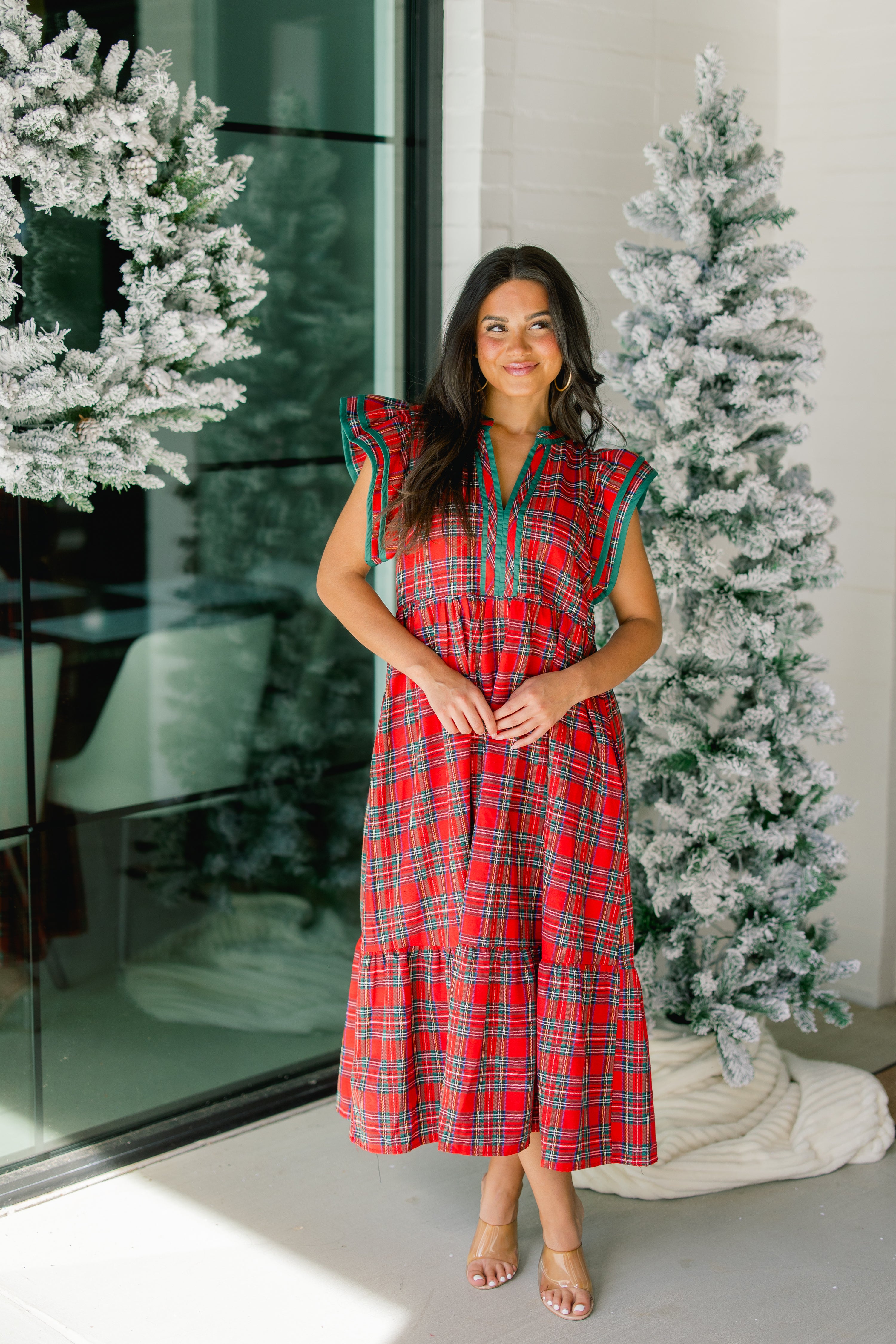 The Plan Ahead Plaid Midi Dress is the perfect mix of holiday cheer and timeless charm. With its classic red plaid print, trimmed in deep green accents, and playful flutter sleeves, this midi dress is made for moments that matter. The tiered skirt adds a feminine flow, while the split neckline keeps it effortlessly chic. From family photos to festive dinners, this dress makes holiday dressing simple and stylish. 80% Polyester, 20% Cotton.