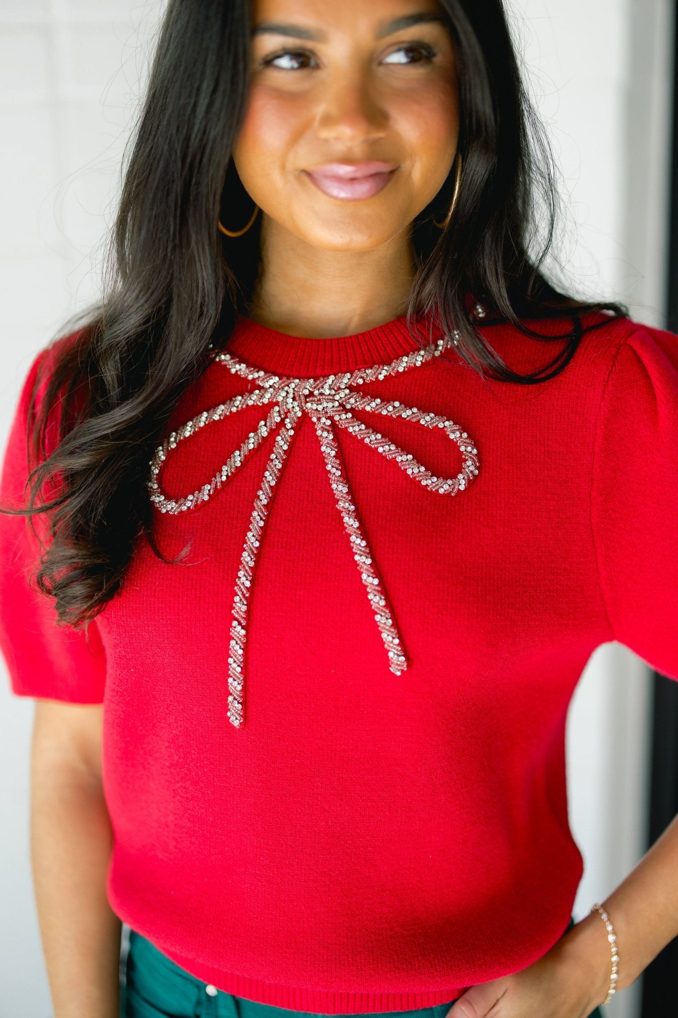 Wrapped In Red Bow Sweater Top – Rhinestone Embellished Knit