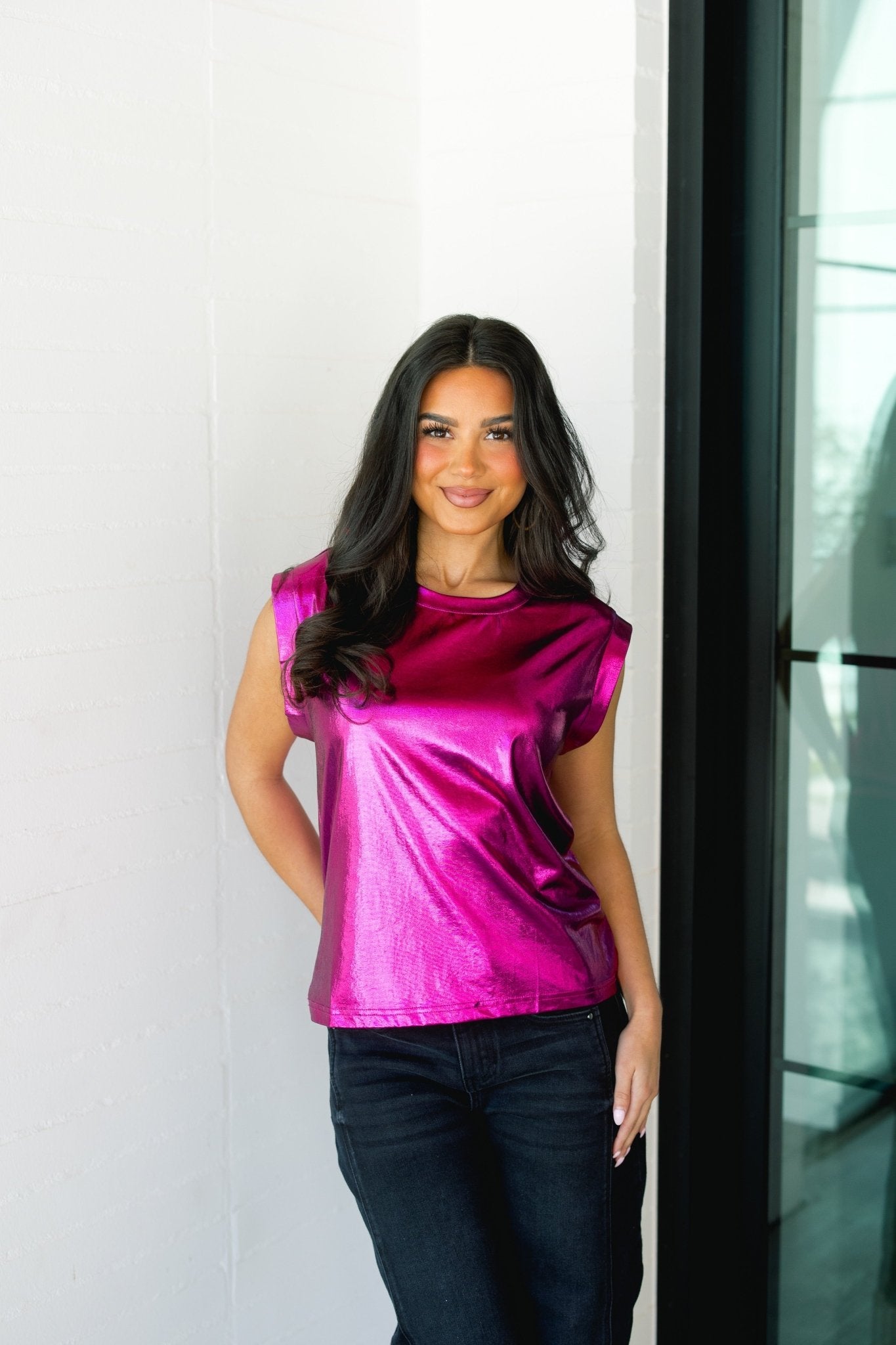 Add some sparkle to your outfit with this bejeweled magenta top! Its delicate shimmer will add an eye-catching touch to any look, and its lightweight design makes it perfect for layering. An essential piece for your wardrobe that will make any outfit shine! 95% Polyester, 5% Spandex