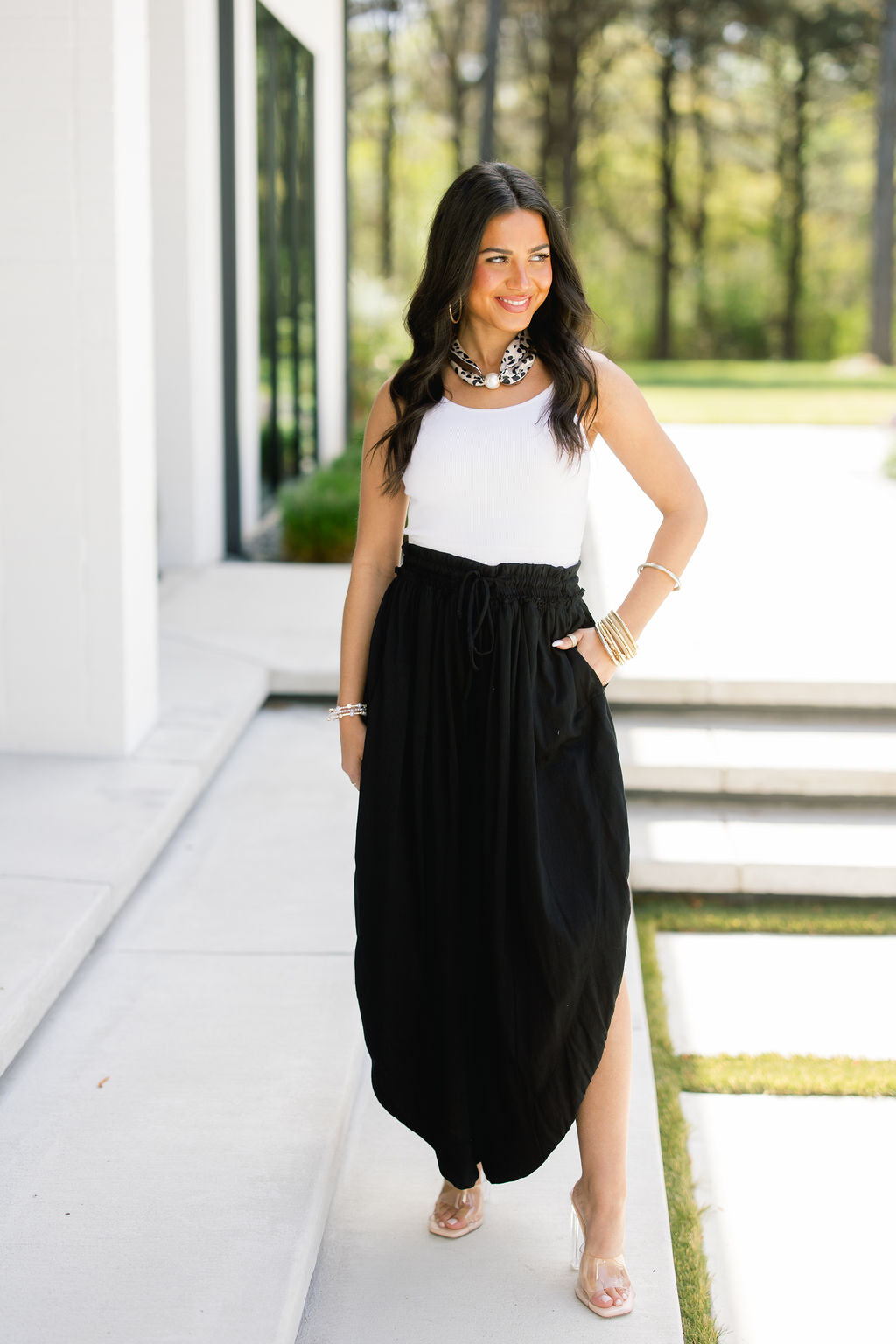 - Match with a fitted white bodysuit and delicate gold jewelry for a tonal, elevated evening look