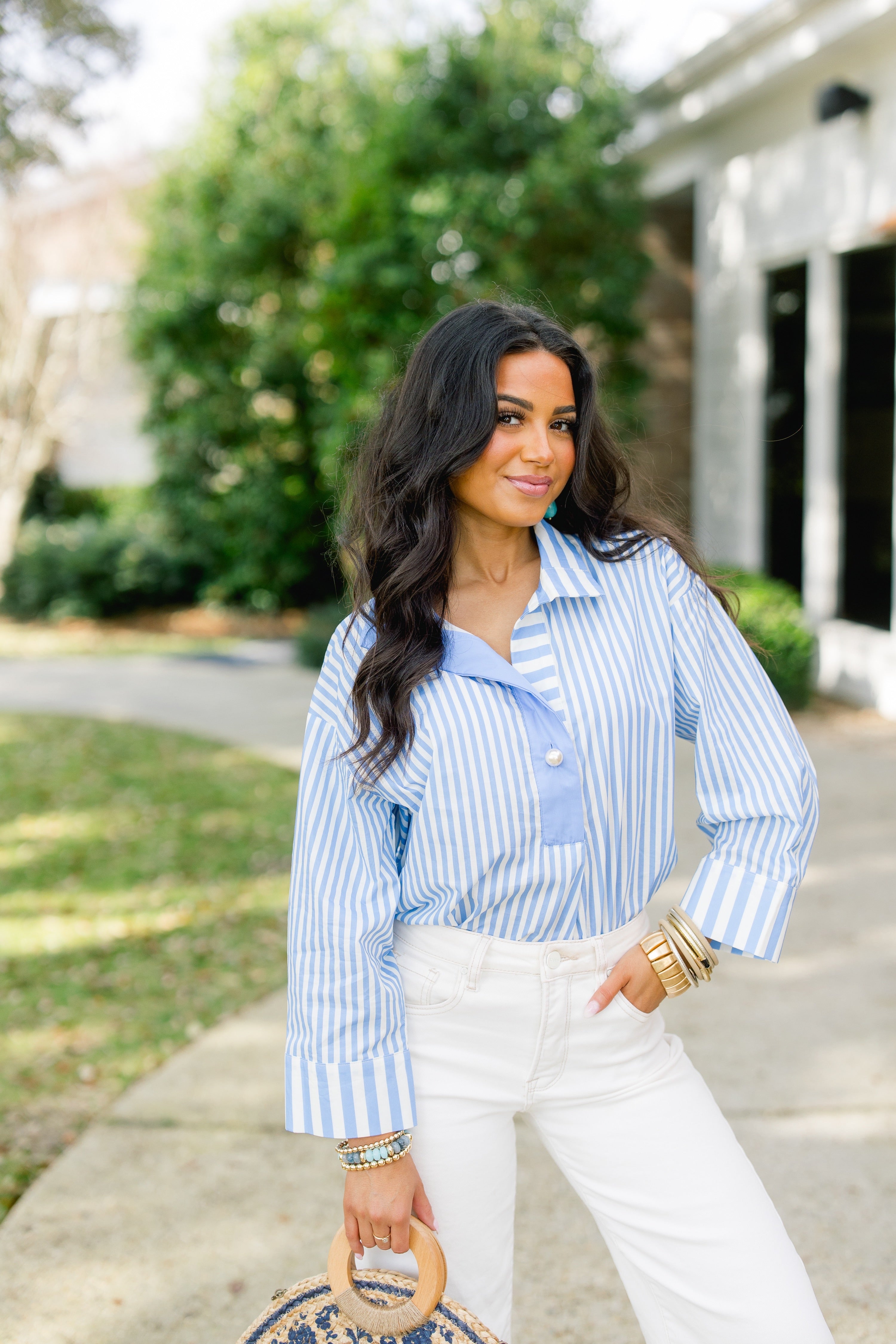 Crisp, classic, and effortlessly polished — the Bella Blue Striped Top is the kind of piece that instantly elevates your everyday look! Featuring timeless blue and white vertical stripes, this top brings a fresh coastal feel with just the right touch of tailored charm.