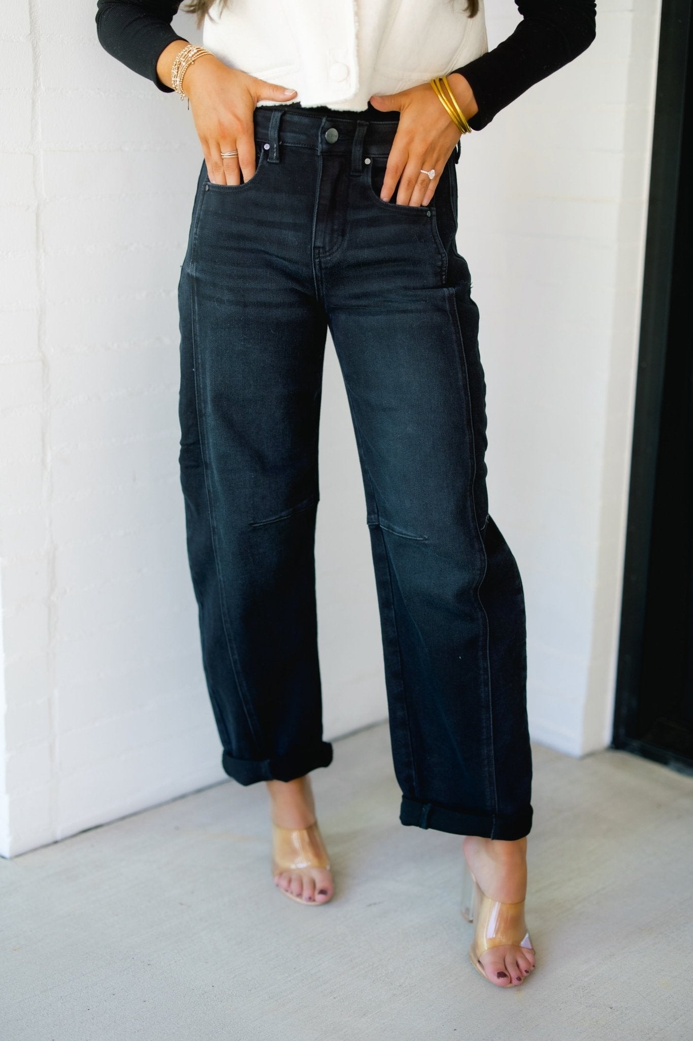 Black Barrel Cuffed Denim – High Rise Relaxed Fit Jeans with Tapered Leg