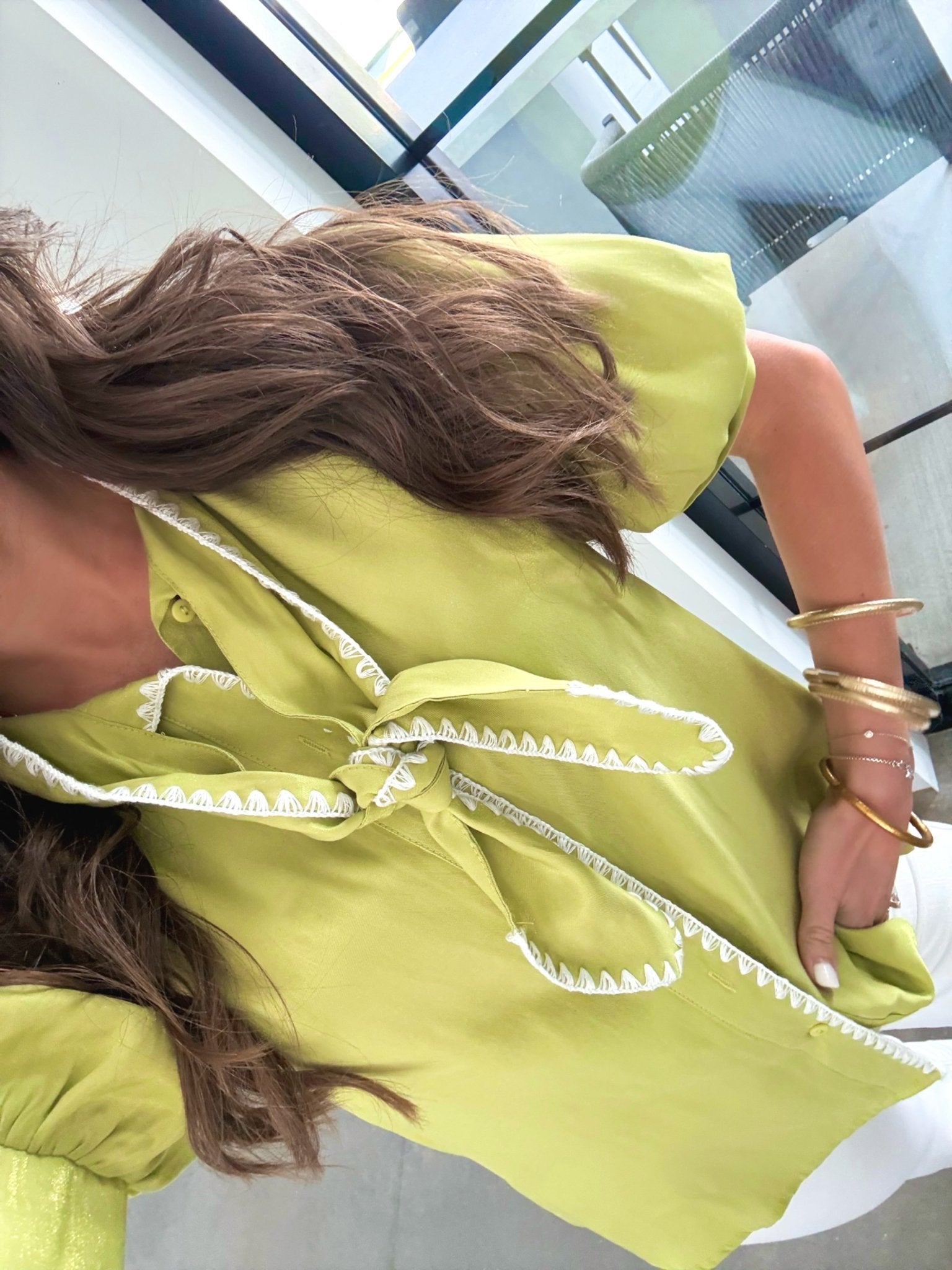 This blouse is a statement piece that brings instant personality to your wardrobe. The vibrant chartreuse hue feels fresh and modern, while the oversized collar with contrast white trim adds a vintage-inspired touch. Puff sleeves with gathered cuffs create a romantic, feminine silhouette that's equal parts playful and polished. It's the kind of top that elevates even your simplest bottoms. Polyester