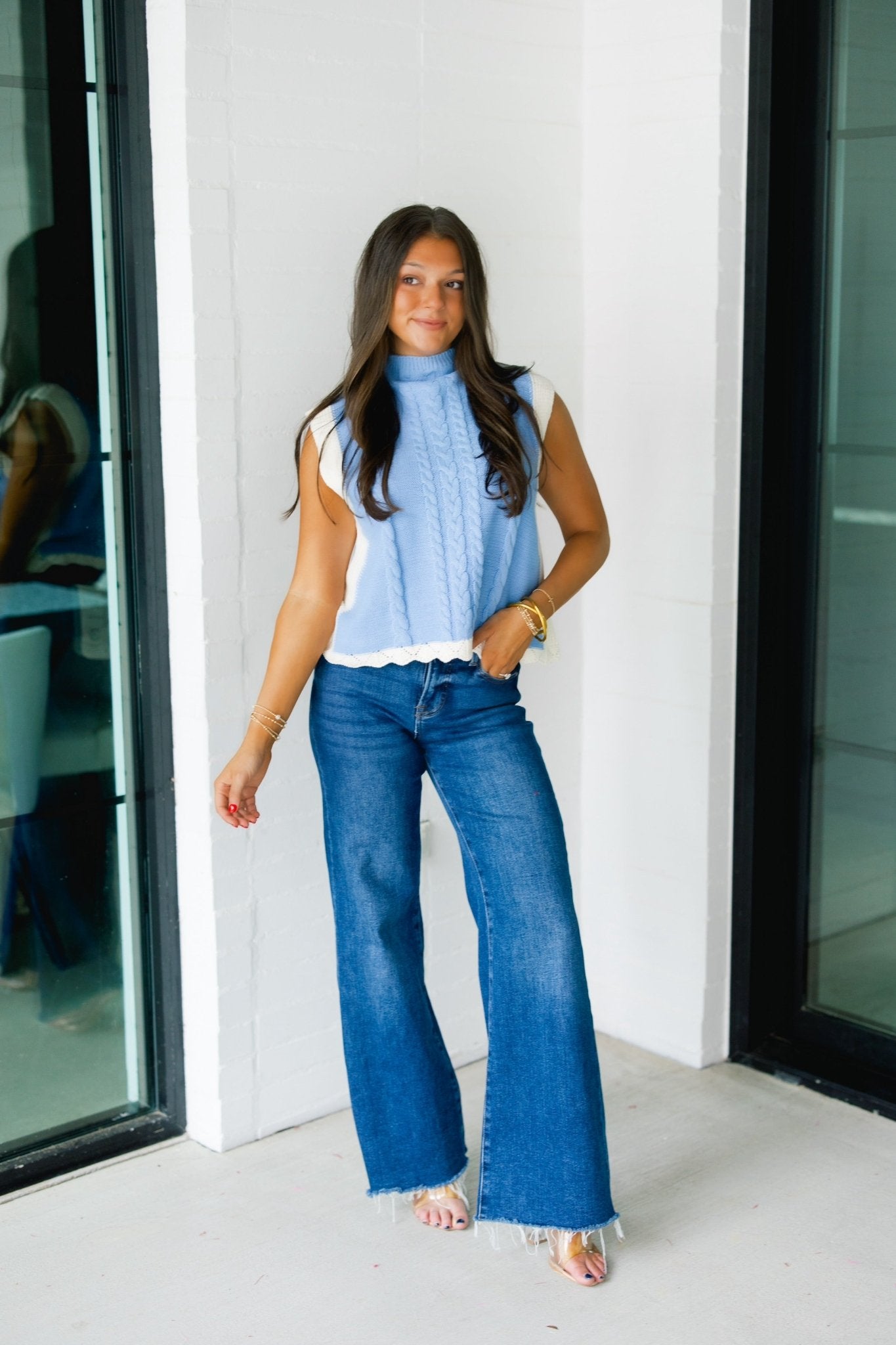 Soft, serene, and effortlessly polished, the Coastal Calm Blue Sleeveless Sweater is a chic layering essential with timeless appeal. Designed in a calming sky-blue hue, this knit features a classic cable-knit texture down the front for added dimension and a refined finish. The sleeveless silhouette keeps it modern and versatile, while the subtly scalloped hem adds a feminine touch that elevates the look. 60% Cotton, 40% Viscose.