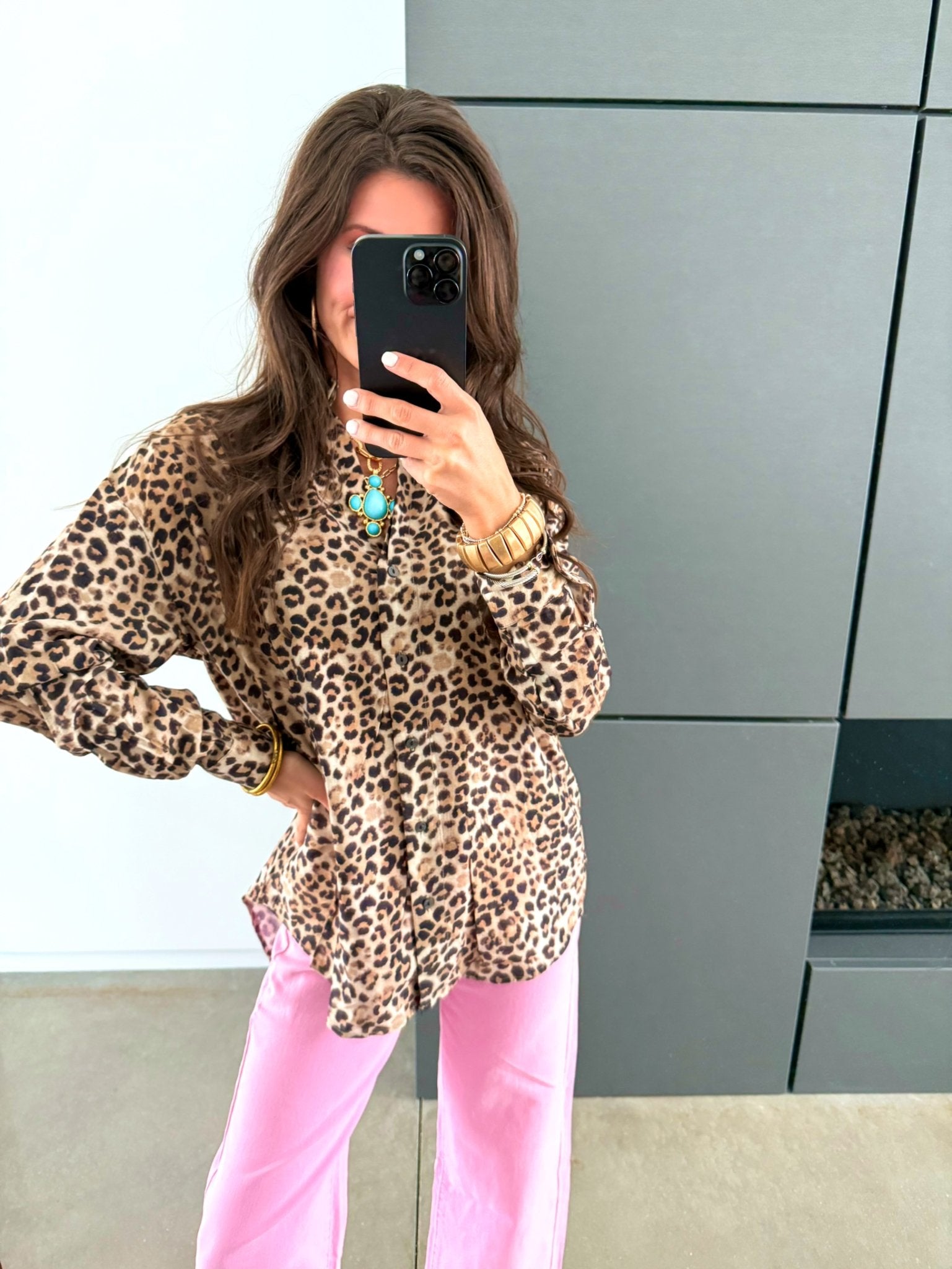 Designed with a relaxed button-down silhouette, it offers an effortless, flattering fit that can be styled a variety of ways. Wear it tucked, tied, or layered for a look that feels both polished and playful. The lightweight fabric drapes beautifully, making it comfortable enough for all-day wear while still bringing that bold, fashion-forward edge!