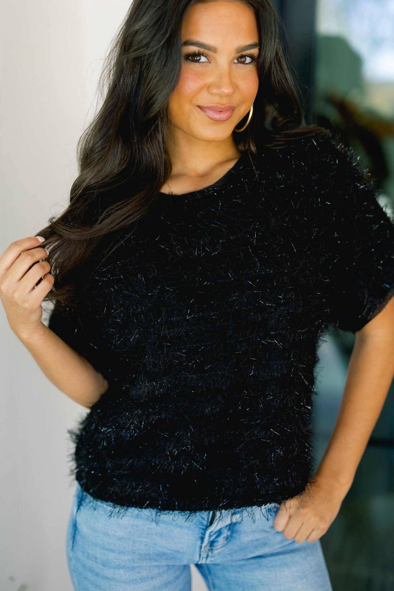 Glamour Girl Black Top – Textured Shimmer Blouse with Short Sleeves