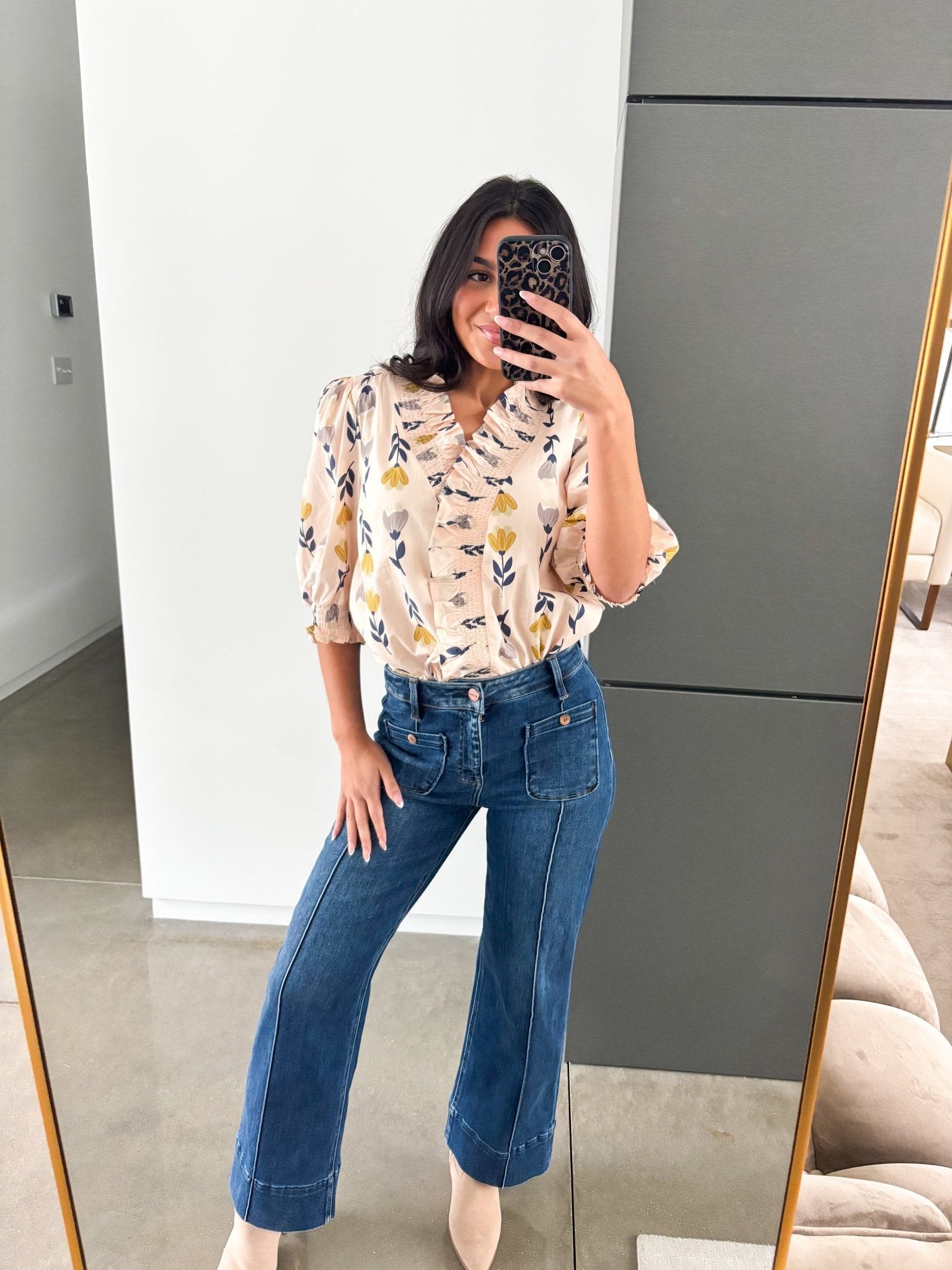 ✨ A cream floral blouse that transitions seamlessly from day to night—just like your never-ending plans.