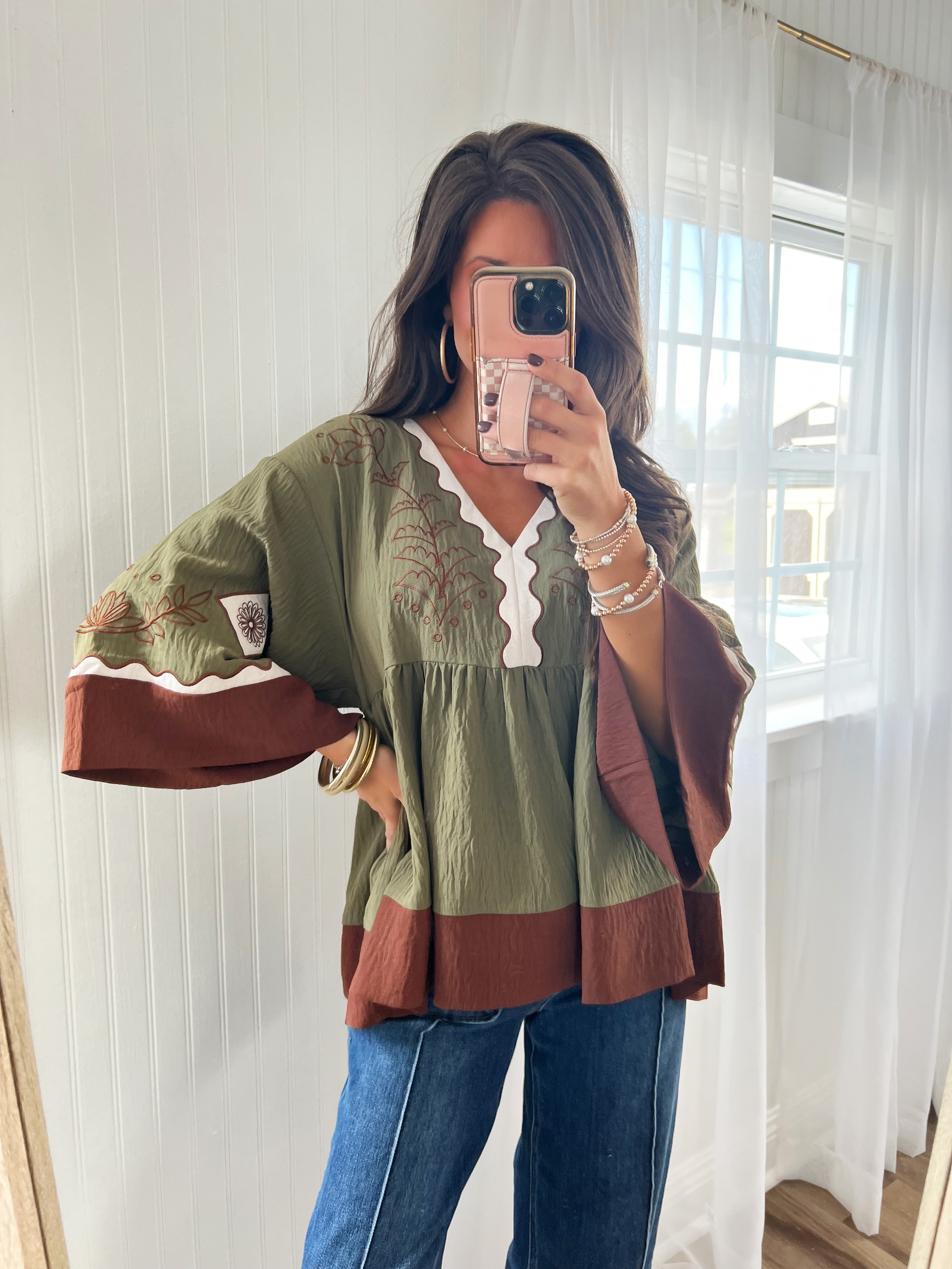 Where earthy tones meet effortless style — the Opposites Attract Olive Top is a chic statement piece with a touch of boho charm. Designed with contrast embroidery and scalloped detailing along the neckline, this top beautifully blends soft olive green and rich mocha brown for a warm, grounded look. The tiered hem and billowy sleeves create a relaxed silhouette that feels as good as it looks. 100% Polyester.
