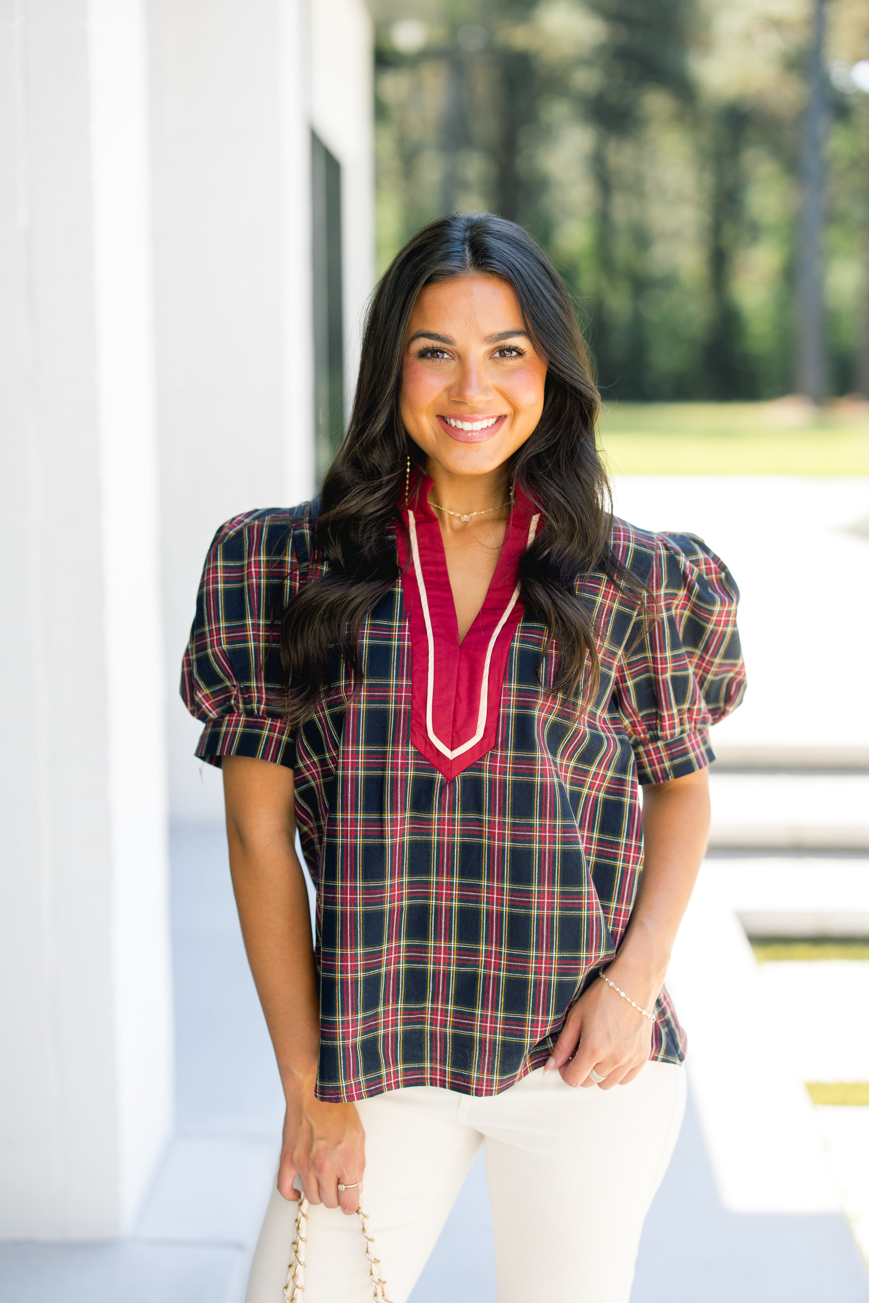 Classic plaid, but make it chic. The Pretty in Plaid Navy Top features puff sleeves, a flattering V-neckline trimmed in bold red, and a navy plaid print that’s timeless with a twist. Whether styled with denim for a casual day or leather pants for a dressier vibe, this top makes plaid look polished and modern. Cotton