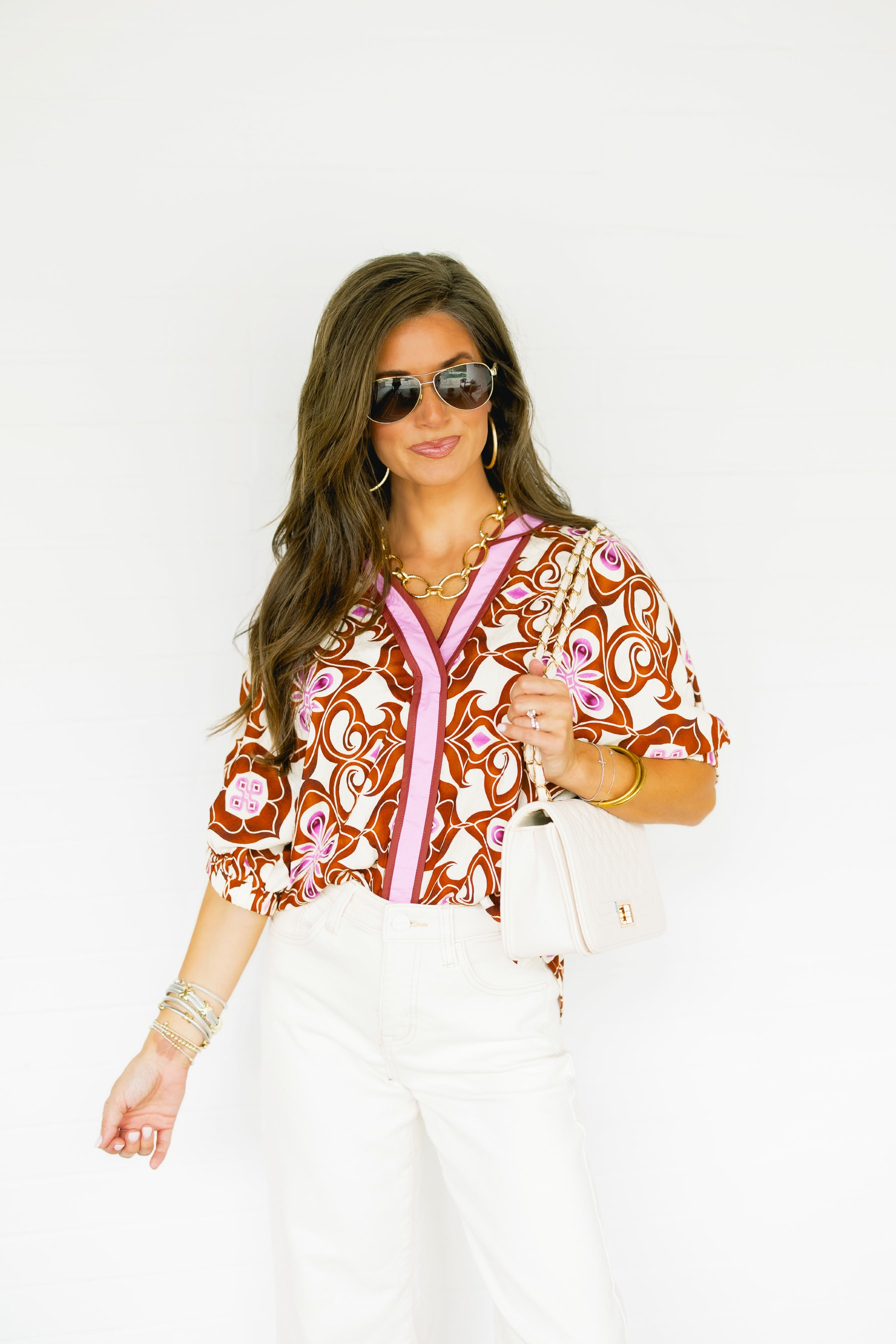 Make a statement with the Retro Bloom Print Top. Featuring swirls of earthy brown and pops of pink floral, this lightweight blouse brings vintage charm with a modern twist. The relaxed fit, V-neckline with contrast trim, and gathered sleeves make it effortlessly stylish for work, weekends, or wherever life takes you. 83% Rayon, 17% Nylon.