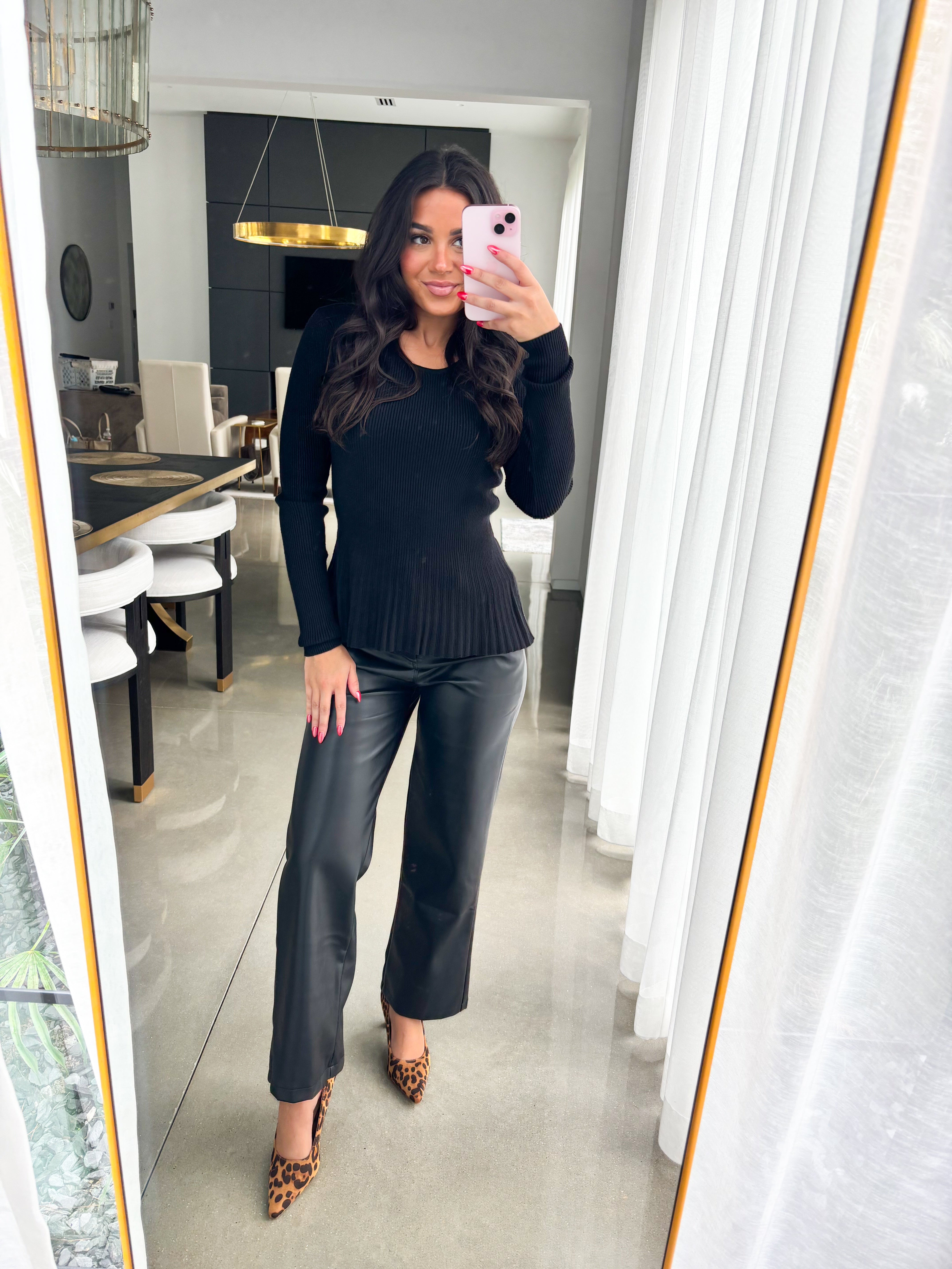 This So In Love Sweater Top in black is a playful essential for your wardrobe. Its fitted knit design hugs your shape perfectly, while the charming ruffle hem adds a fun, flirty touch! Wear it solo for a cute look or layer it up for versatile style all year round! 49% Viscose, 28% Polyester, 23% Nylon