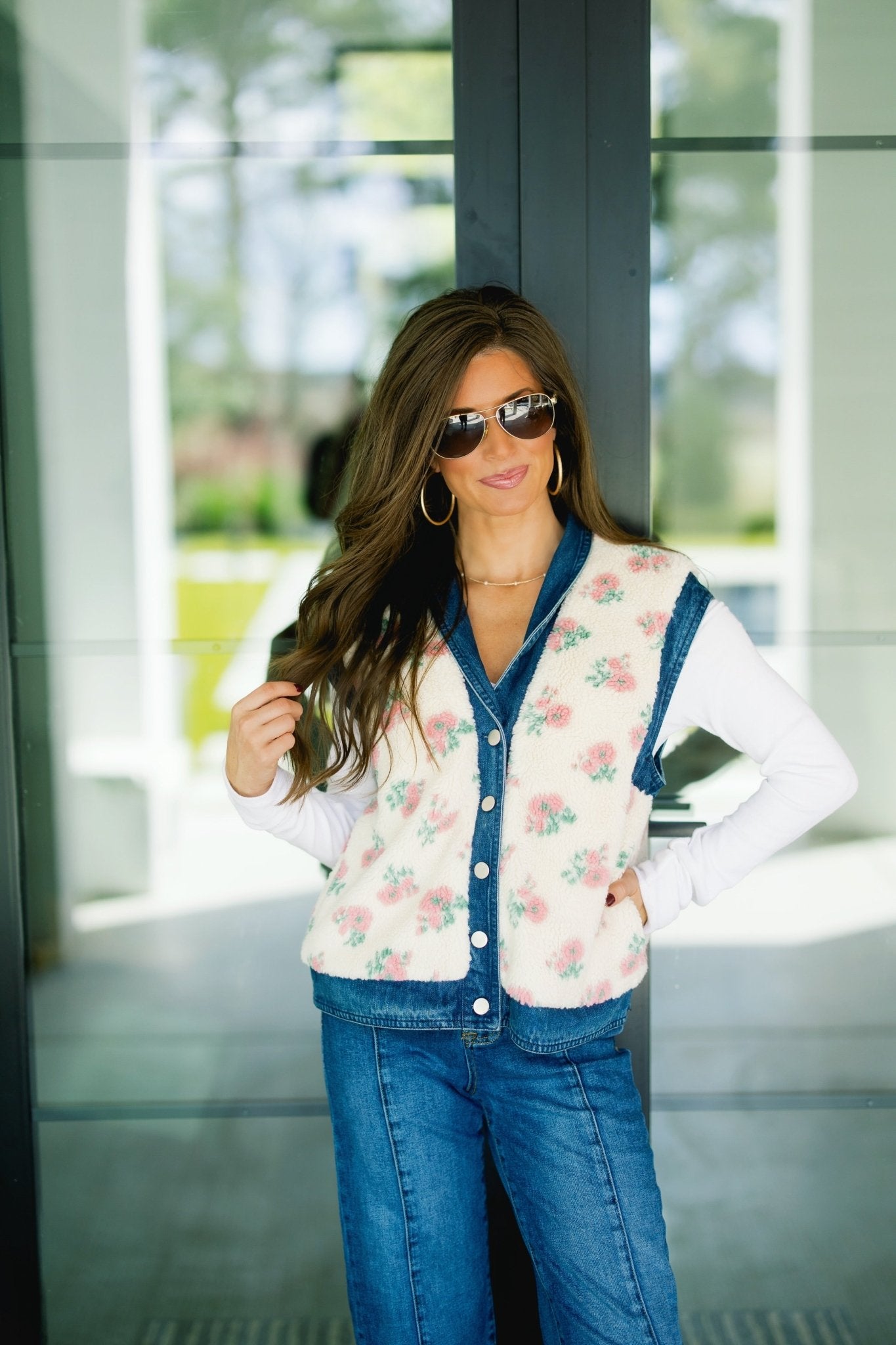Teddy Sherpa Floral Vest – Denim Trim Cozy Chic