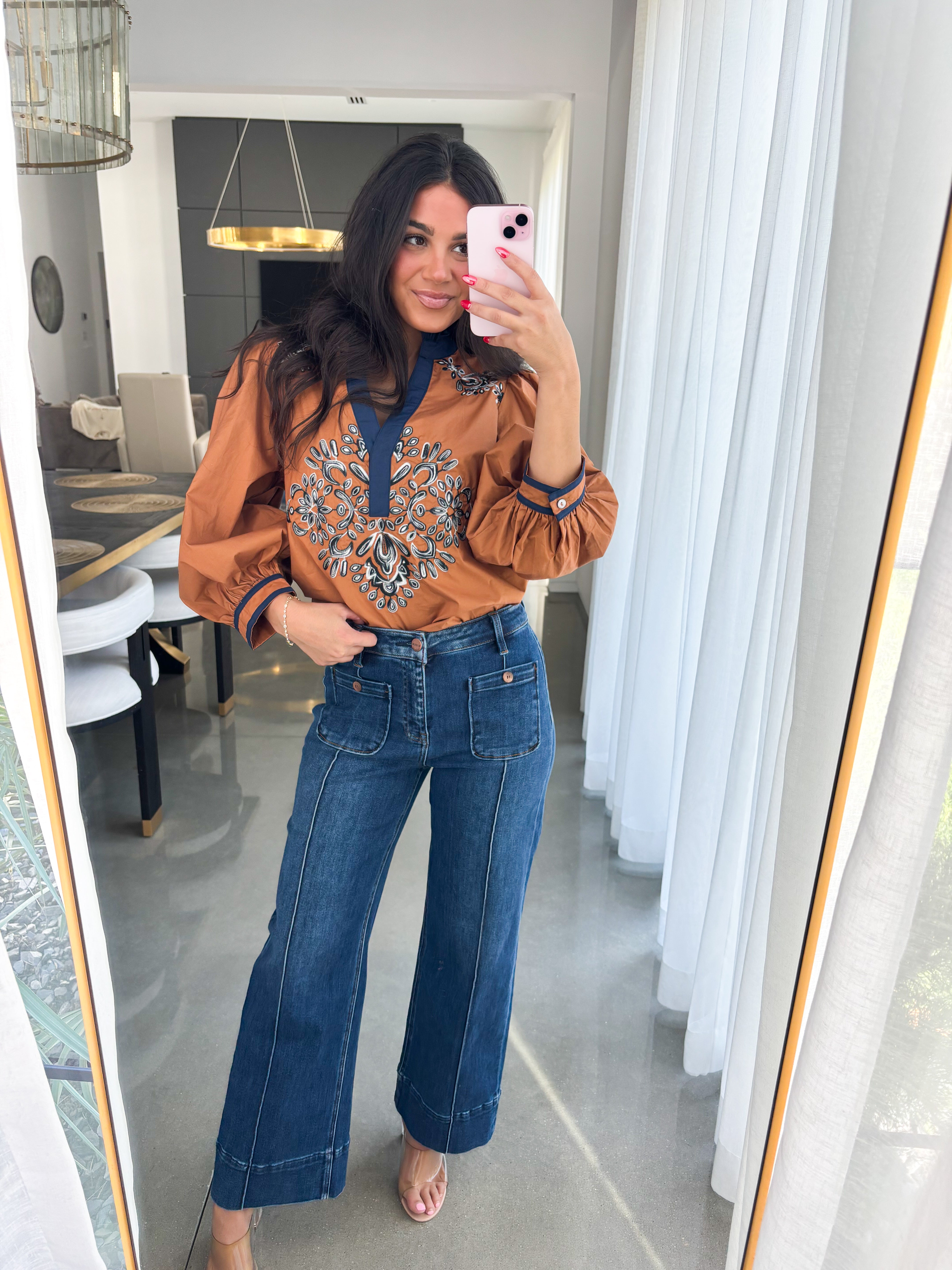 The Color Of Fall Camel Top captures everything we love about autumn—warm hues, timeless charm, and a touch of detail that makes a statement. Designed in a rich camel shade, this top features intricate navy and ivory embroidery across the neckline and bodice, creating a chic, eye-catching contrast. The ruffled collar and three-quarter puff sleeves add a feminine touch, while the relaxed fit makes it effortless to style for both casual and dressier occasions. 100% Cotton.
