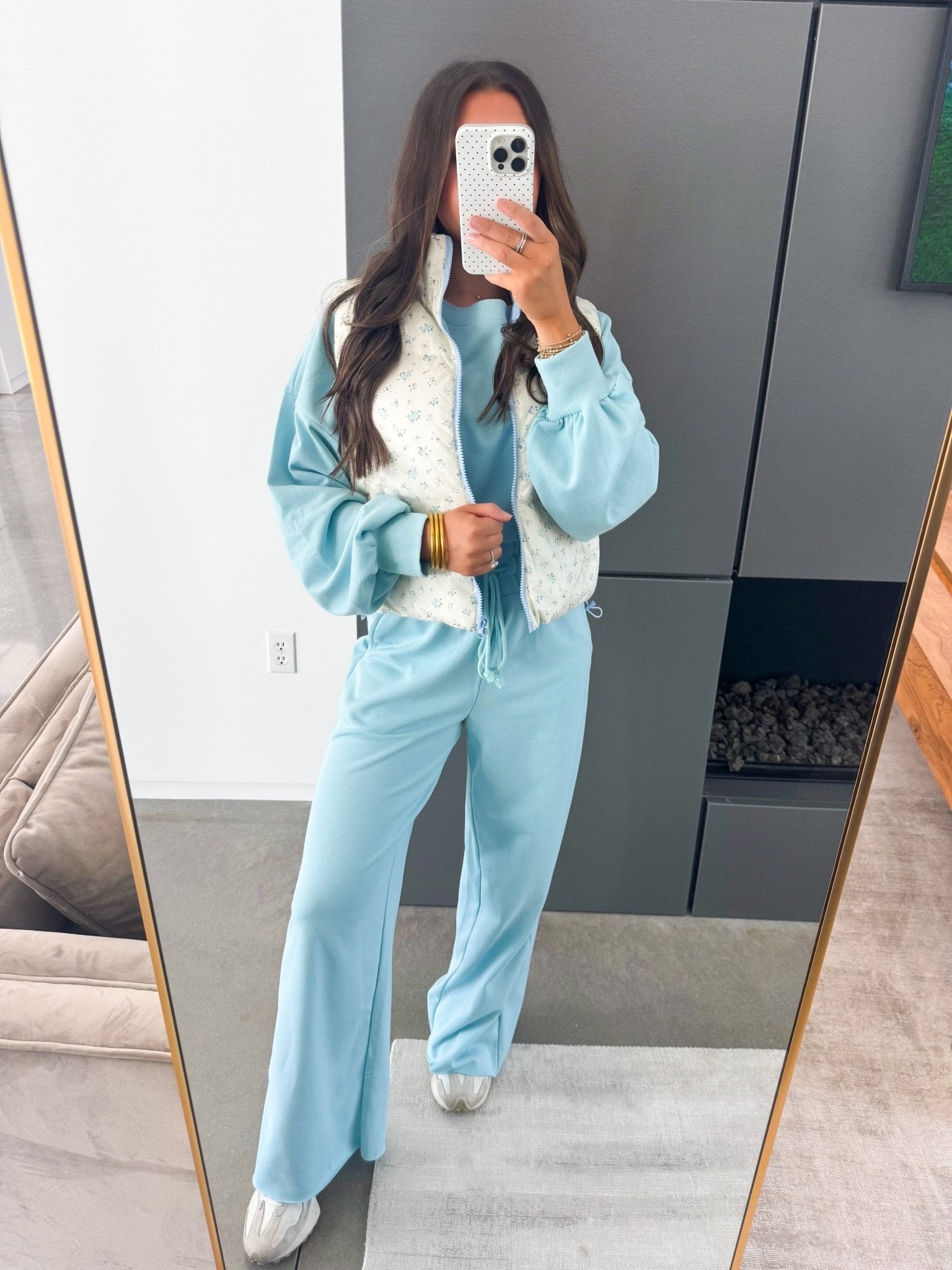 Stay cozy and stylish wherever the day takes you in the Blissful Blue Set. This dreamy two-piece features a soft cropped sweatshirt and wide-leg drawstring pants in a tranquil sky-blue hue. The relaxed silhouette gives that perfectly undone, off-duty look — while the plush fabric keeps things comfy from morning coffee to weekend errands! 65% Polyester, 35% Cotton.