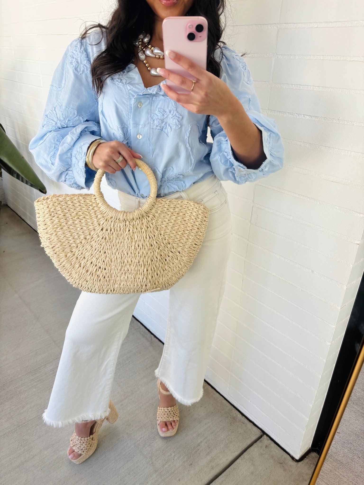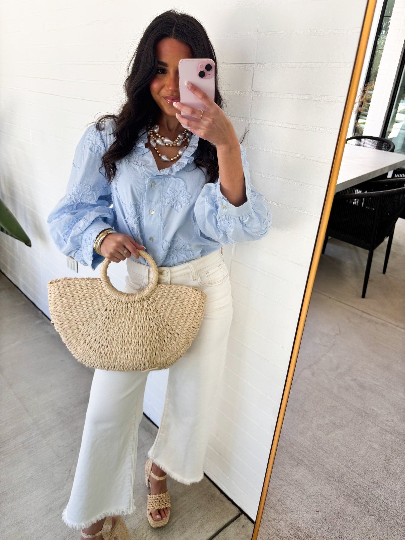 Romantic with a modern edge, the Soft Meadow Bloom Blue Top is a standout piece that brings texture and elegance to your everyday wardrobe. Designed in a soft, airy blue, this top features delicate raised floral detailing throughout for a beautifully dimensional look that feels both feminine and elevated. 100% Cotton.