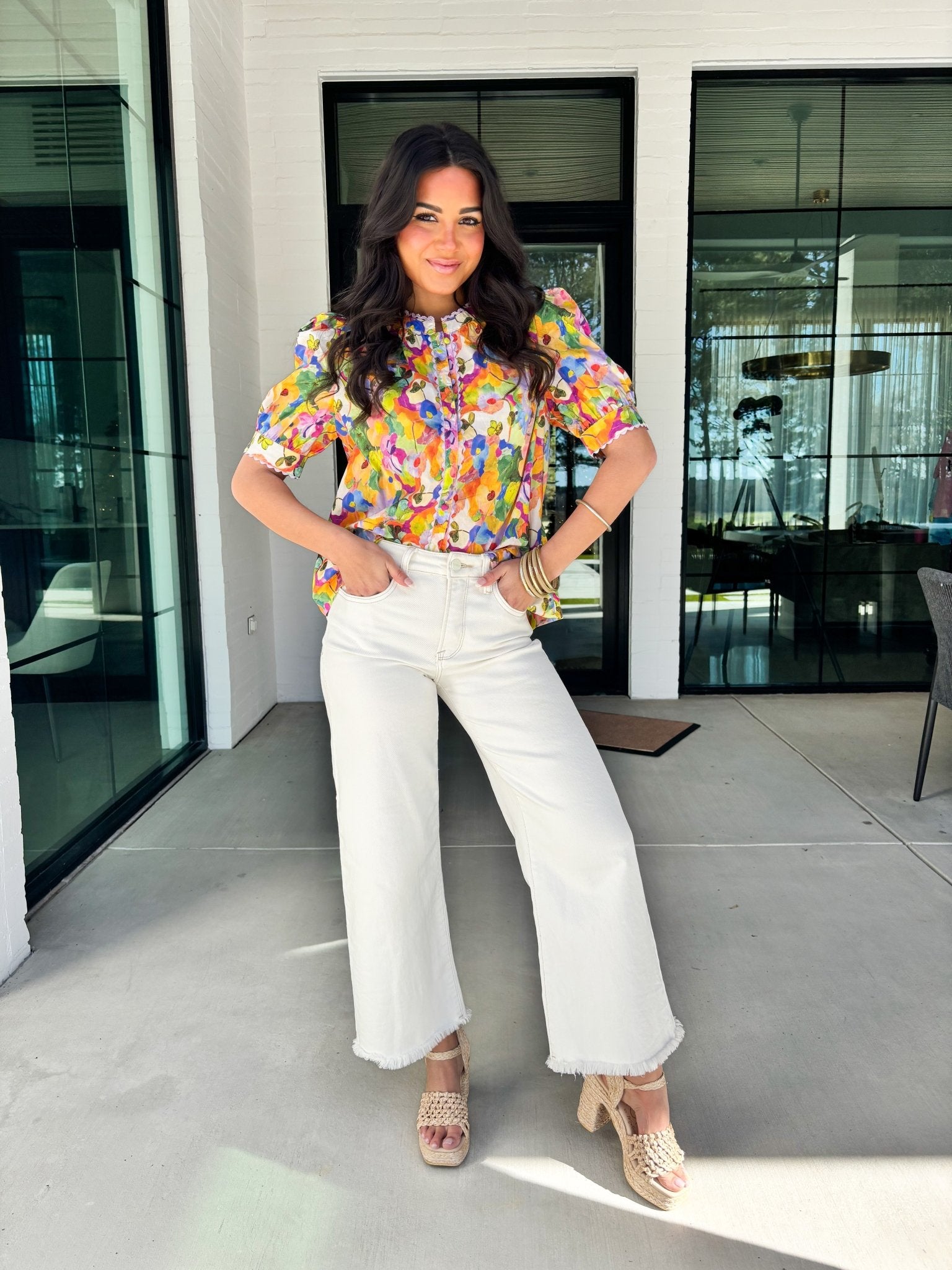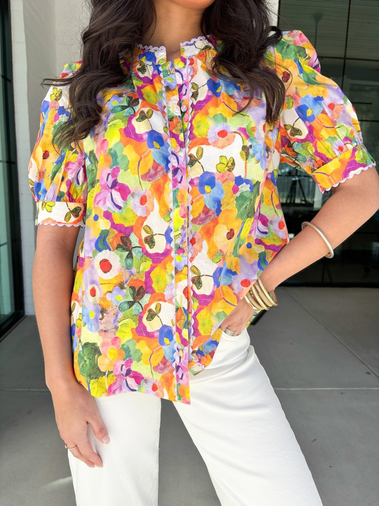 Designed with softly puffed short sleeves, a delicate button-front detail, and subtle smocking at the shoulders, it offers just the right mix of structure and ease. The lightweight fabric drapes beautifully, making it comfortable enough for all-day wear while still looking elevated and put-together!