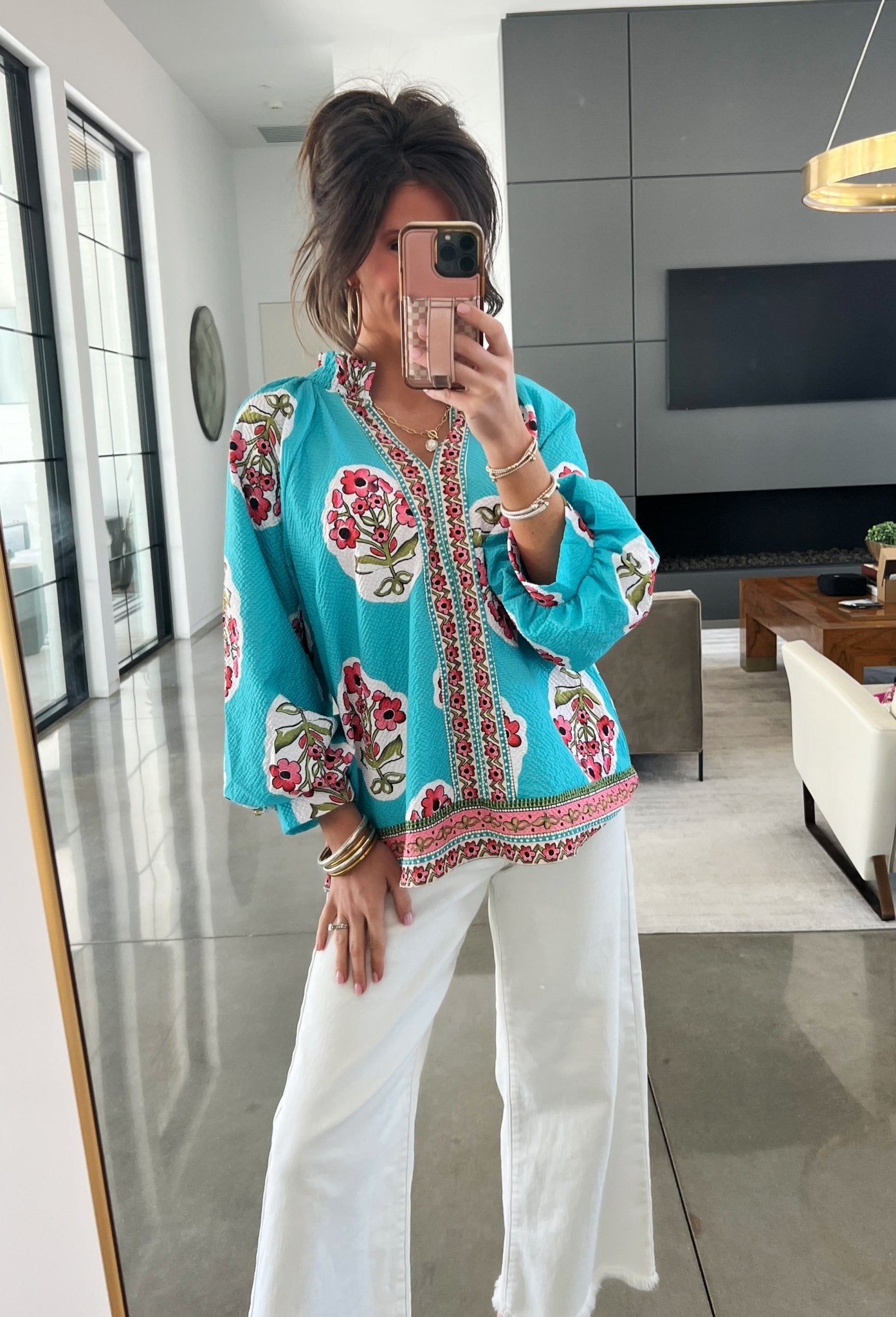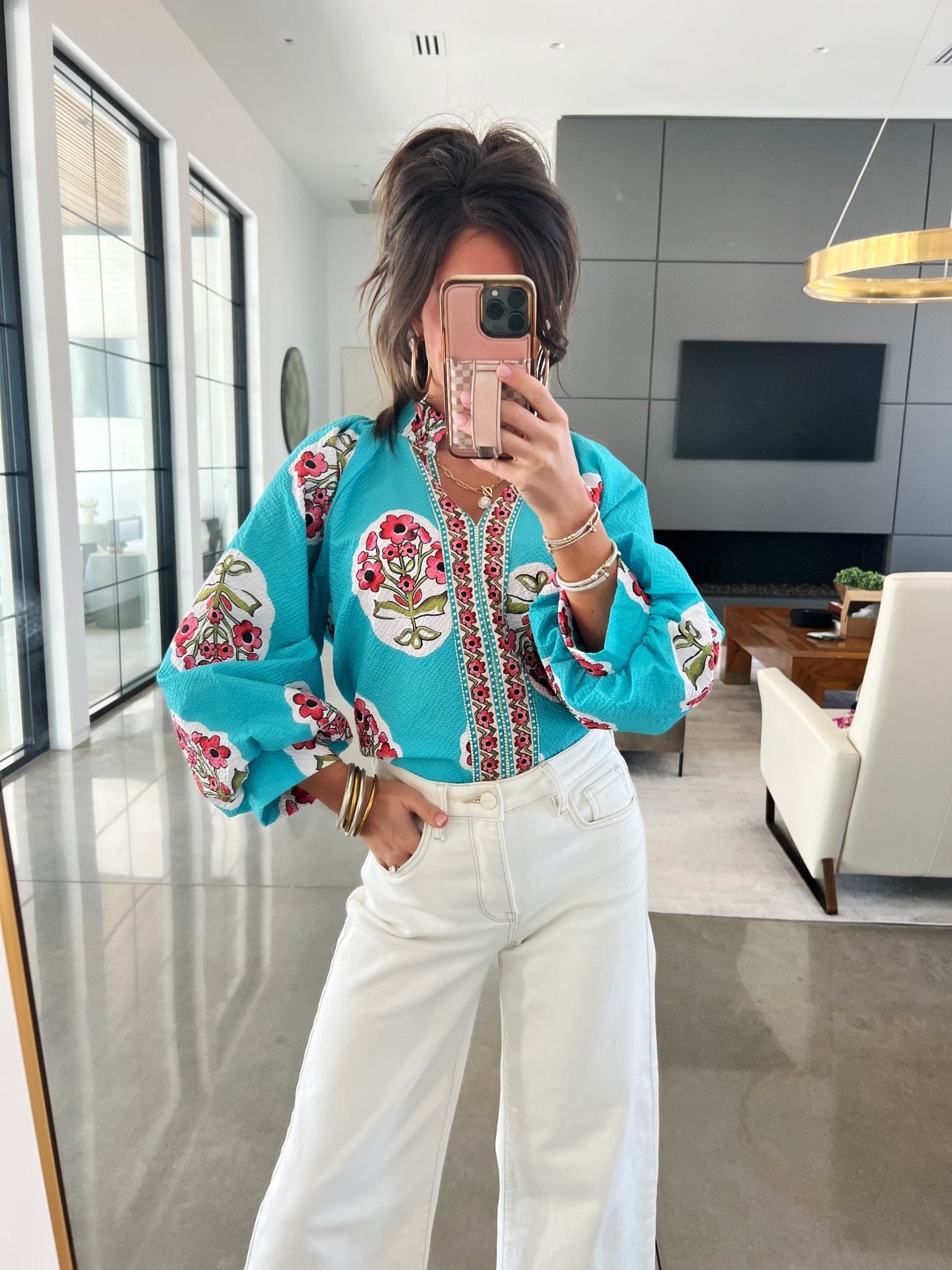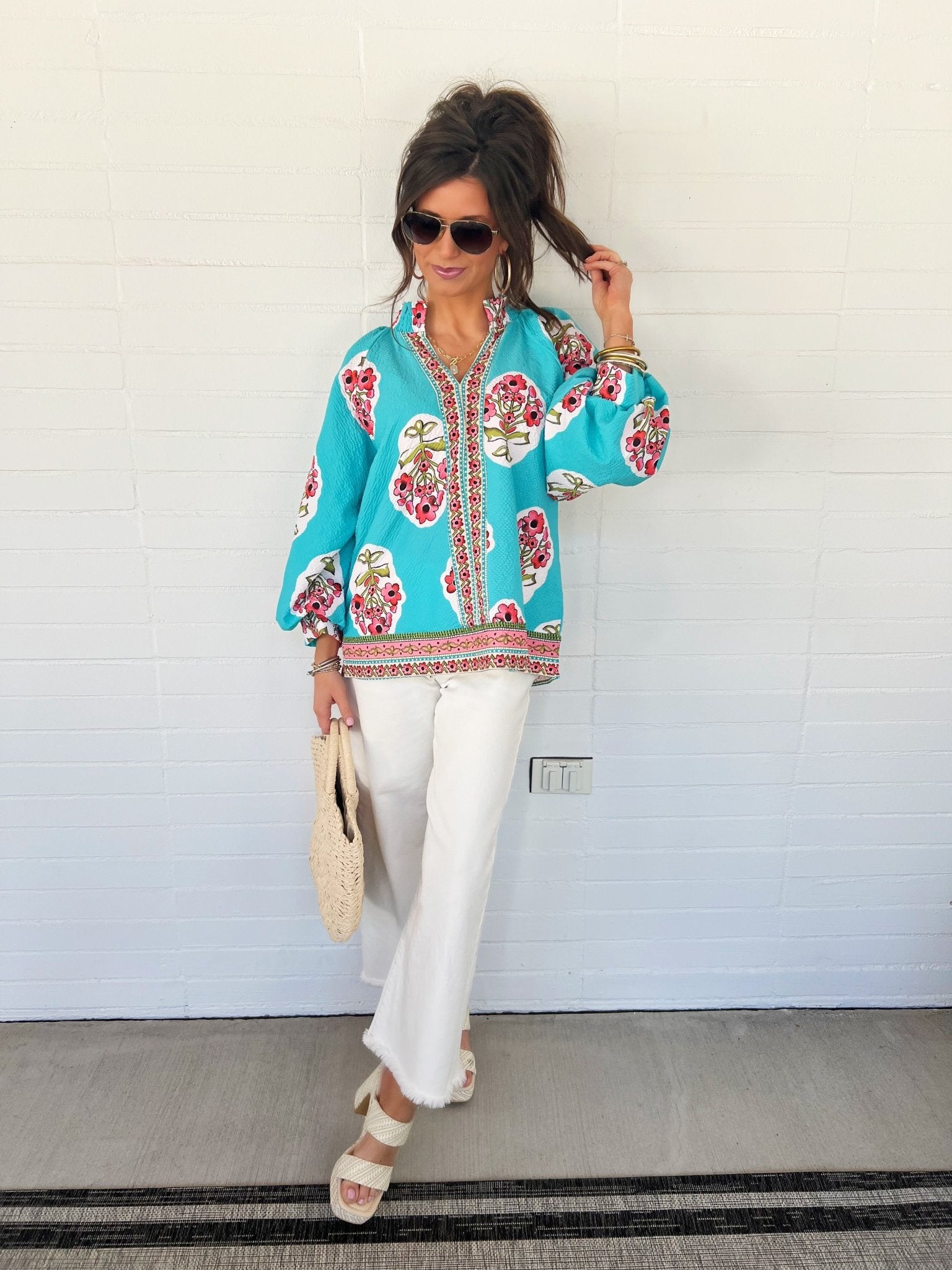 Easy, breezy, and beautifully boho!! The Turquoise Garden Boho Blouse features a vibrant turquoise base with intricate floral motifs and decorative trim that instantly elevate the look. Designed with a split V-neckline and relaxed sleeves, this top brings effortless charm whether you’re styling it with denim, white pants, or your favorite cutoffs. Lightweight with a soft, textured feel, it’s the kind of piece that makes getting dressed feel fun. 100% Polyester
