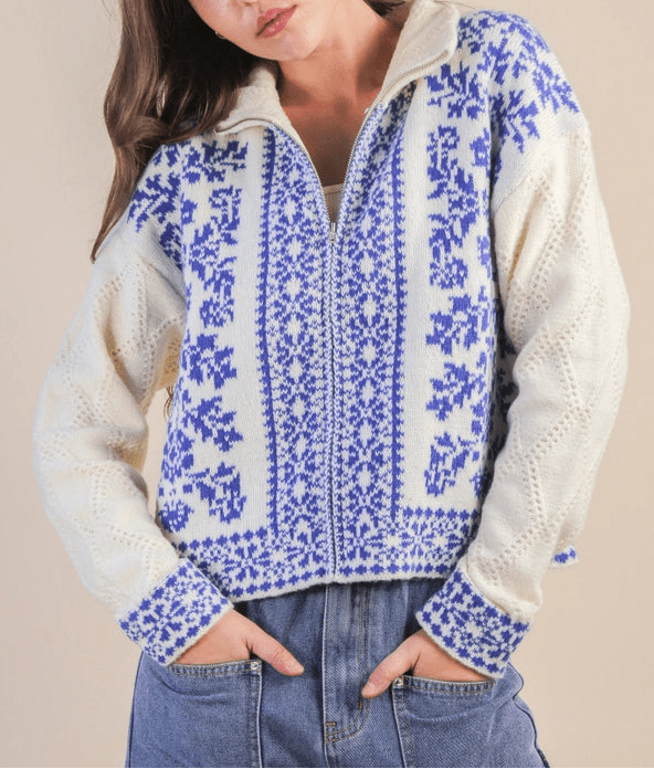Stay warm in style with the Winter Blues Sweater. Featuring a cream base with bold blue knit patterns, this sweater blends timeless design with cozy comfort. The quarter-zip neckline adds a sporty, modern touch while the relaxed fit makes it easy to layer over your favorite basics. Perfect for chilly days, this piece brings both comfort and charm to your winter wardrobe. 95% Polyester, 3% Acrylic, 2% Nylon.