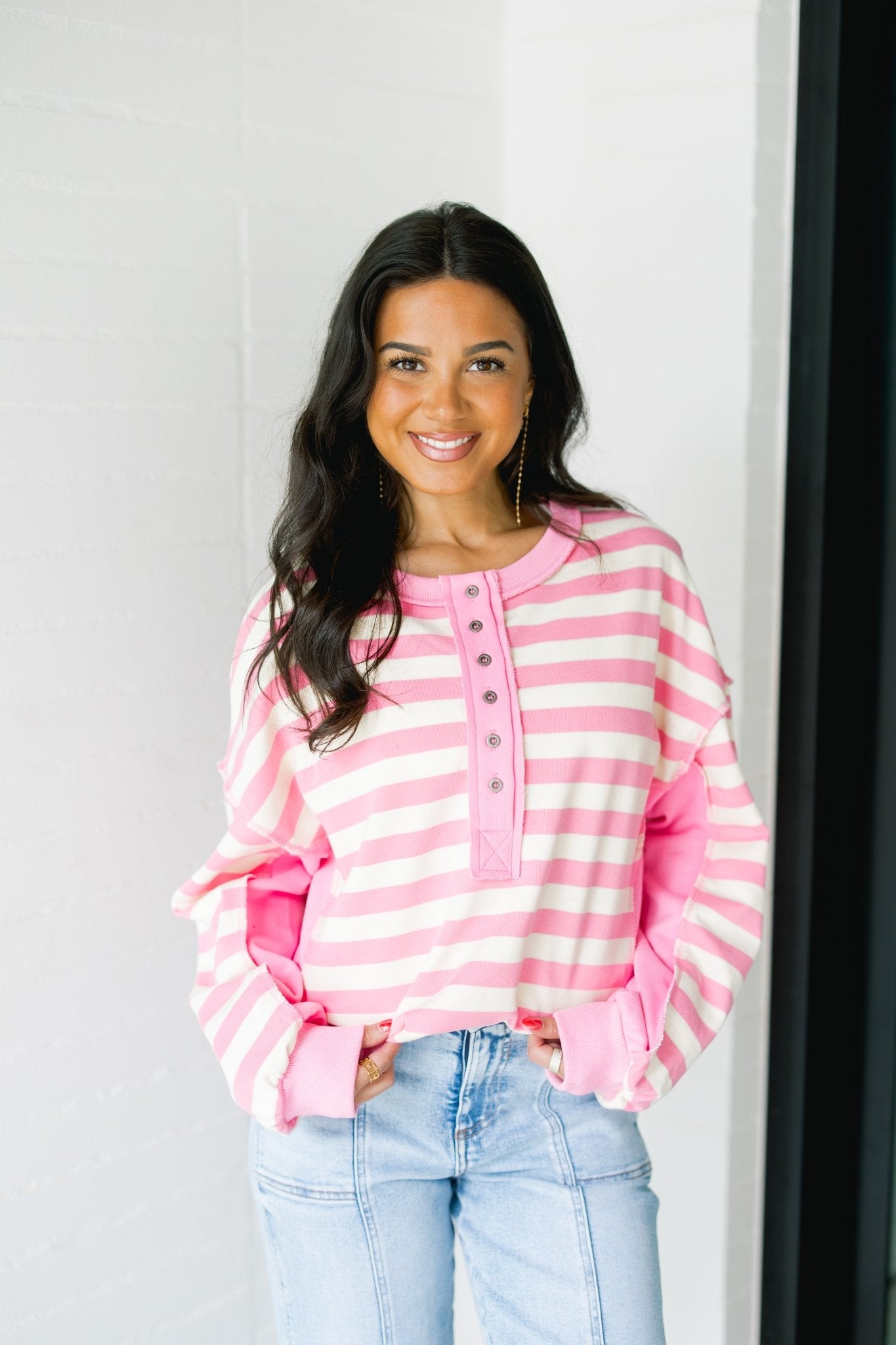 Cutie In Cream And Pink Striped Top – Button Front Henley Sweatshirt