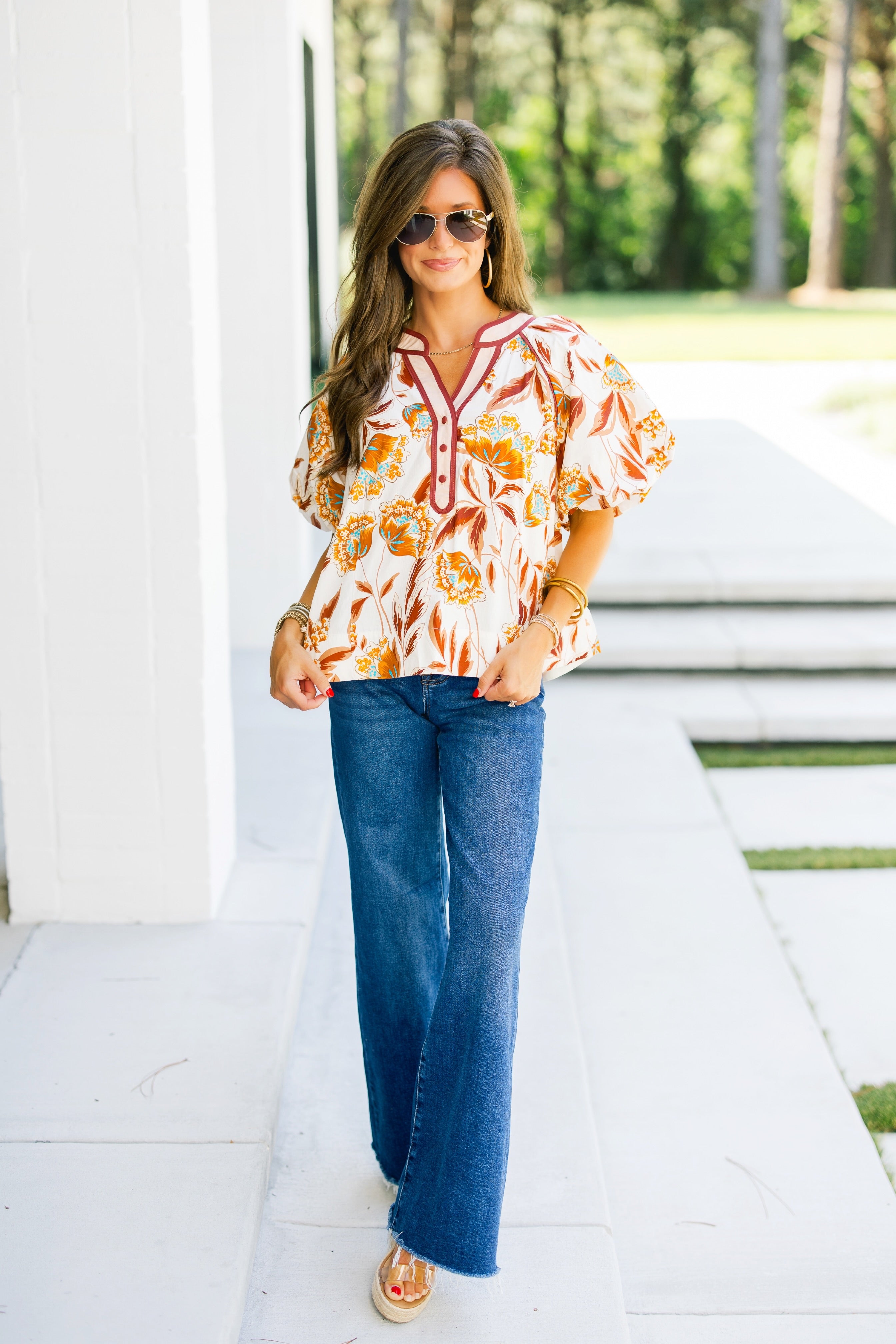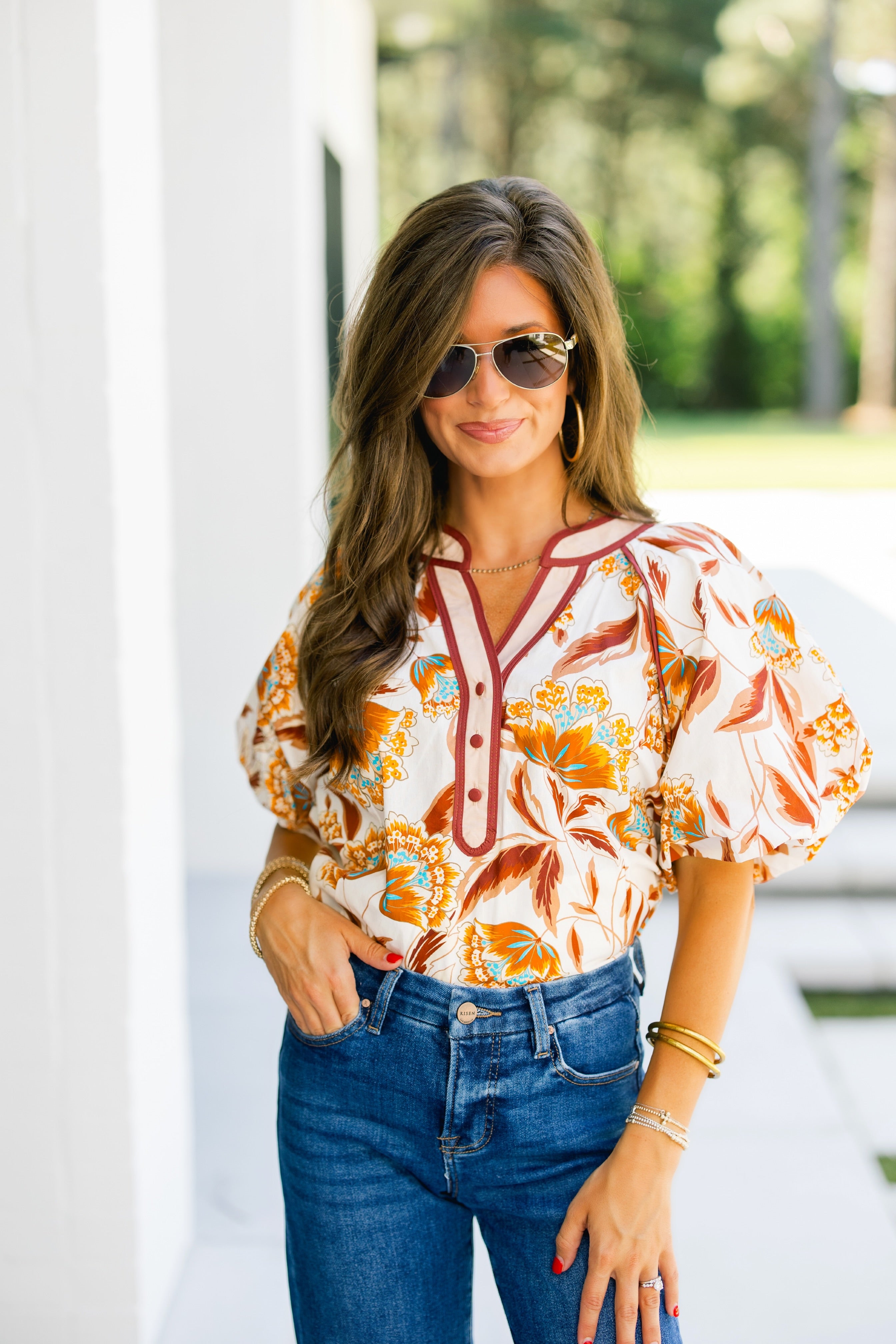 The Everly Ecru Floral Top features delicate puff sleeves and a soft ecru base adorned with a floral pattern in rich fall tones of rustic browns, blues, and oranges. This elegant design captures the essence of autumn, offering a refined and seasonal look perfect for that effortless style you want for your closet this season. Cotton