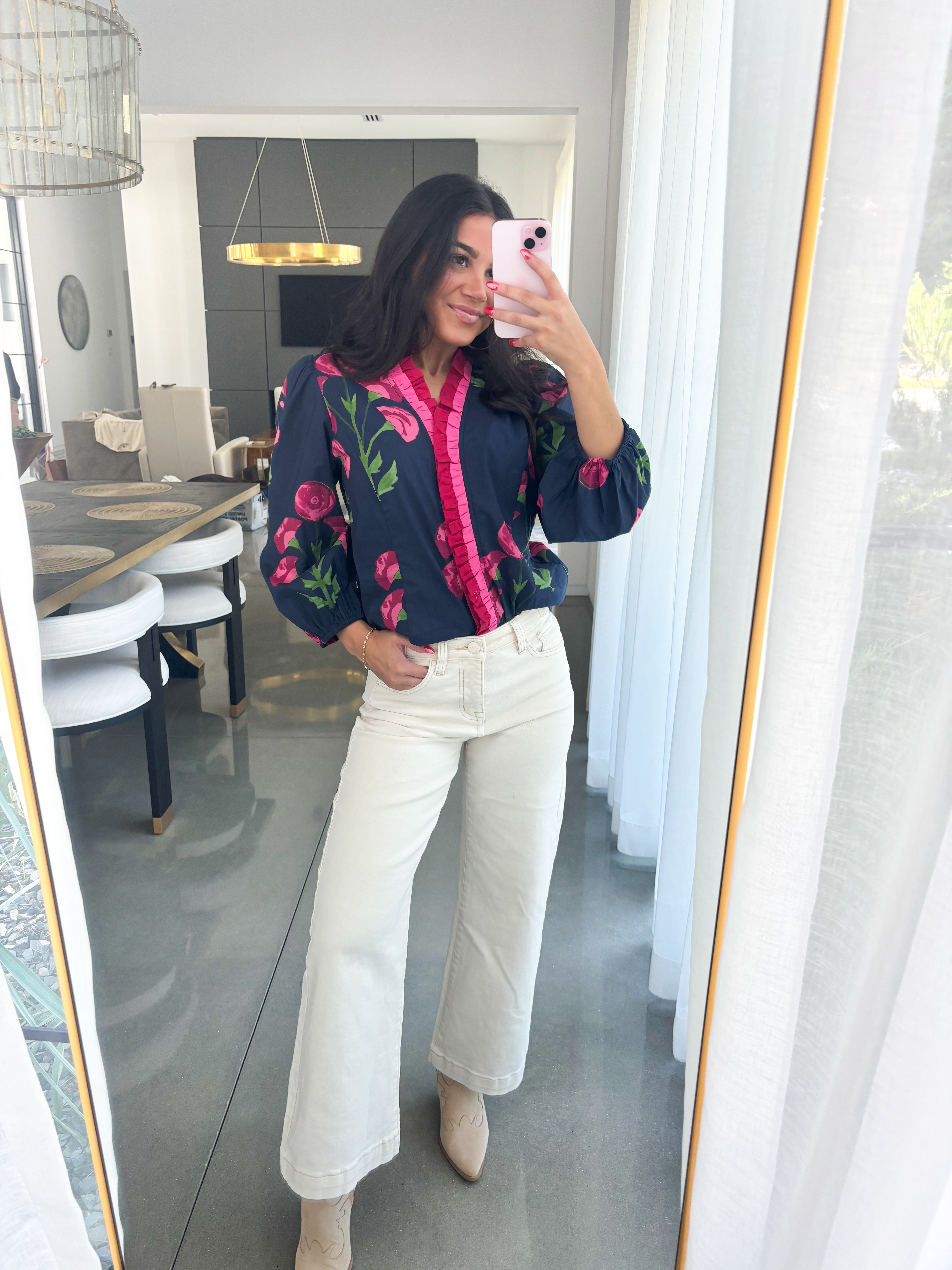 Turn up the charm in the Frills and Florals Navy Top, where bold blooms and flirty details meet. With its deep navy base splashed with vibrant pink florals, this top radiates playful sophistication. The ruffled trim and puff sleeves add a feminine touch, while the structured yet relaxed silhouette makes it easy to wear from work to weekend. 100% Cotton