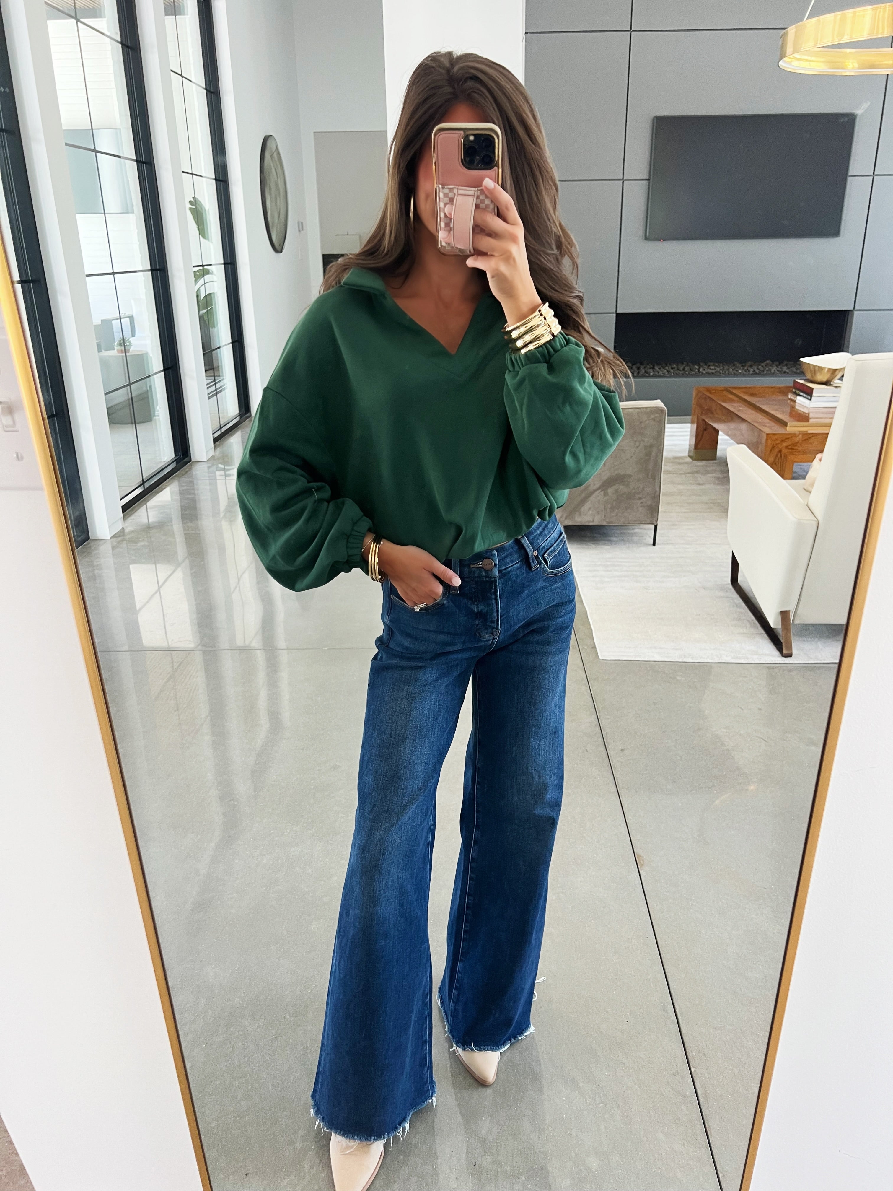 The Gigi Green Fleece Top is your new go-to for effortless comfort and elevated style. Made in a soft fleece fabric, this relaxed pullover features a flattering V-neckline, collared detail, and cinched elastic waist for the perfect balance of laid-back and polished. Its rich green hue makes it an instant statement piece for cooler days. 65% Cotton, 35% Polyester.