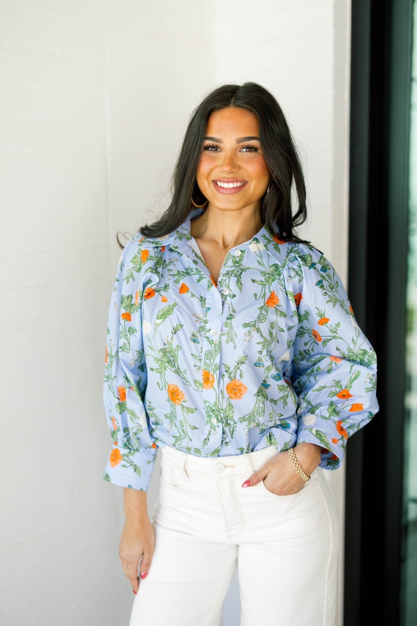 Soft, sweet, and effortlessly charming, the Lovely Little Things Blue Top is all about the details. Featuring a serene blue background with a delicate floral print in soft, warm tones, this top brings a fresh yet timeless feel to your everyday style. 100% Cotton.