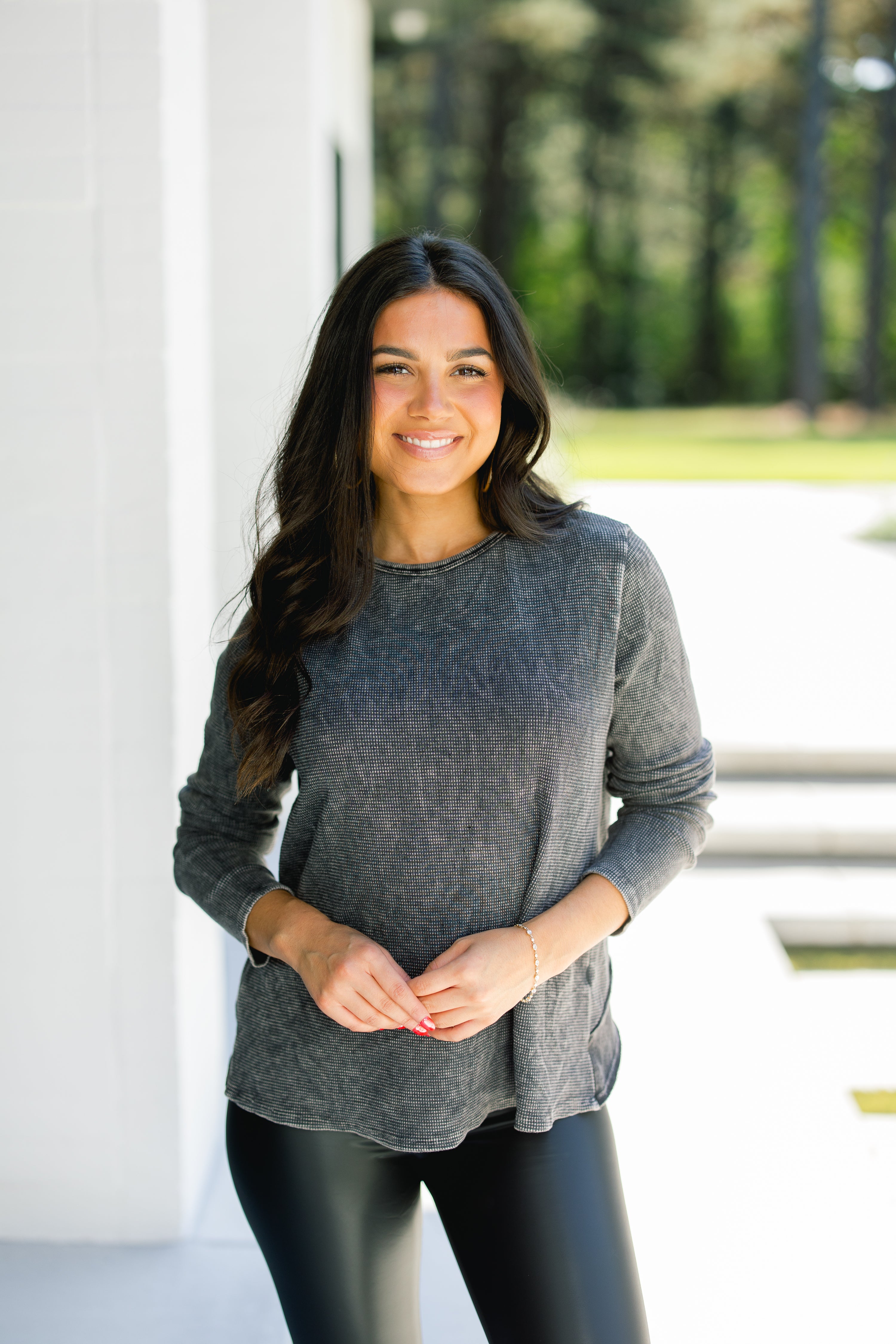 Step into style with the Made For More Mineral Wash Open Back Top. Designed in a rich black mineral wash, this top brings the perfect mix of casual edge and feminine allure. The standout detail? A daring open back with tie accents, making it a true statement piece. Relaxed yet striking, it’s the versatile top your wardrobe’s been waiting for—perfect for dressing up denim or layering over bralettes and tanks. 50% Cotton, 45% Polyester, 5% Spandex.