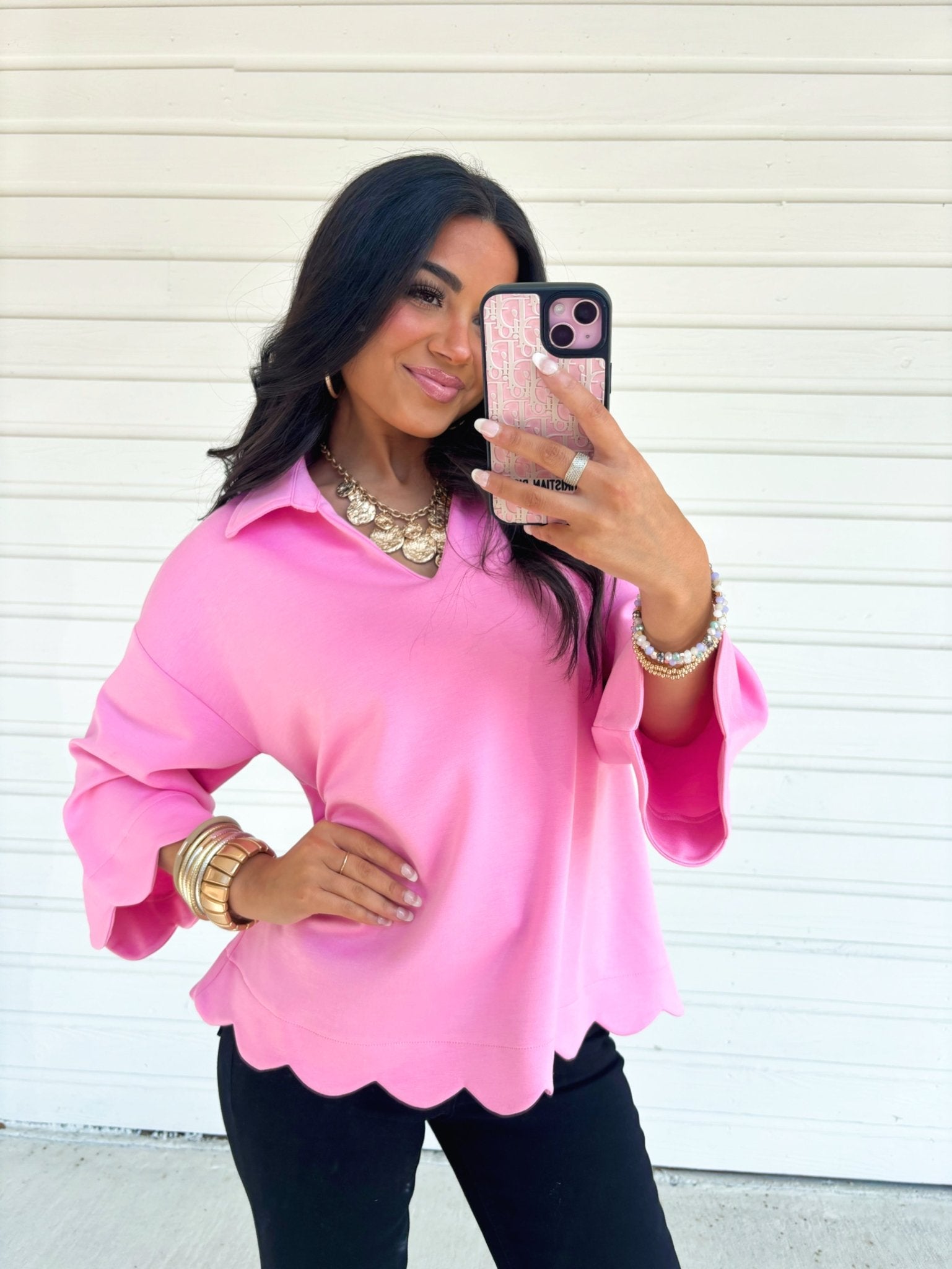 Elevate your everyday rotation with this dreamy pink knit top, featuring a sophisticated collared v-neck and playful scalloped edges! Perfectly crafted from ultra-soft fabric, it offers a chic, effortless silhouette that transitions seamlessly from office hours to weekend brunch. 50% Rayon, 45% Polyester, 5% Spandex.