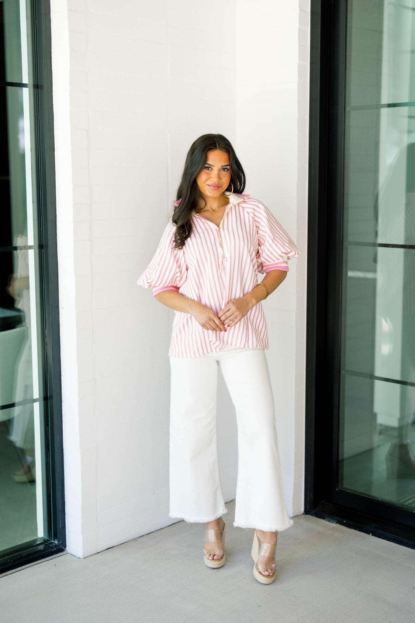 Sweet, sporty, and perfectly polished — the Playful Prep Pink Striped Top brings a fresh pop of color to your everyday wardrobe. Featuring classic pink-and-white stripes, statement puff sleeves, and a chic zip-up neckline, this top blends preppy charm with modern flair. It’s the kind of piece that instantly looks styled with minimal effort.