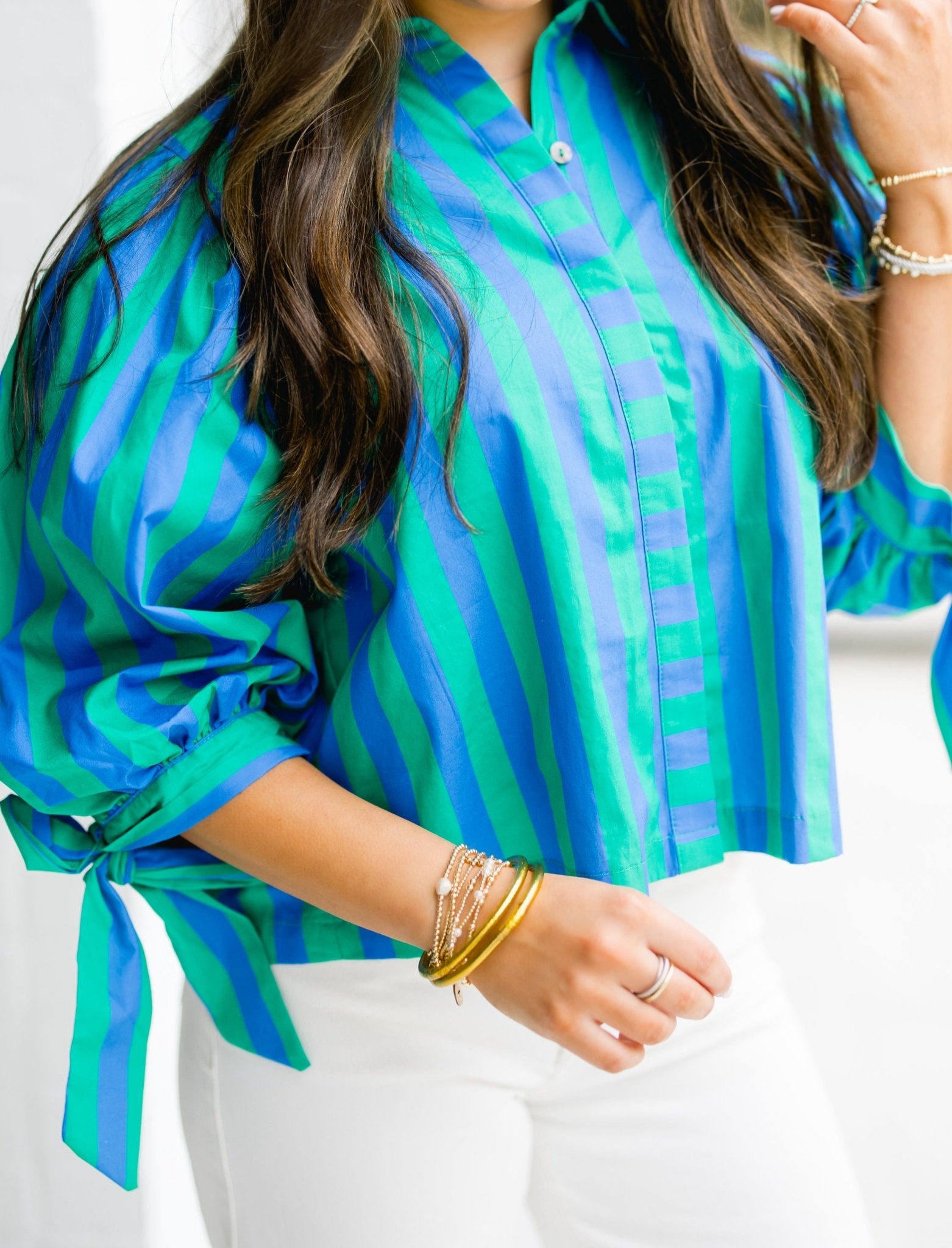 Bold, playful, and effortlessly polished—the Please Stay Striped Top – Green is a standout piece you’ll keep reaching for. Featuring vibrant green and blue vertical stripes, this top brings fresh energy to your everyday wardrobe. Designed with a classic collared neckline, hidden button-front placket, and statement puff sleeves, it strikes the perfect balance between tailored and fun. The lightweight woven fabric gives it a crisp feel while still being easy and breathable. 100% Cotton.
