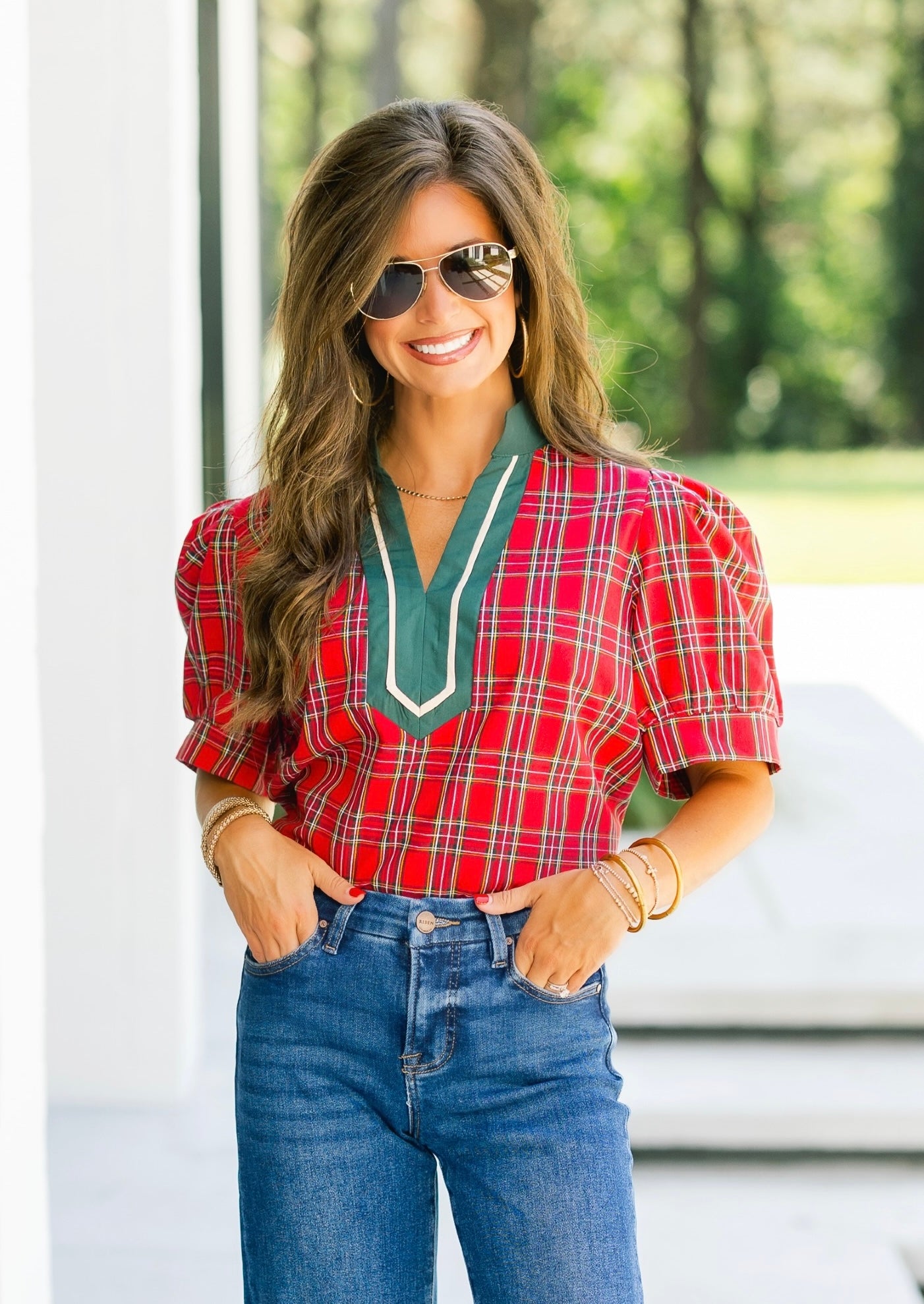 The Pretty In Plaid Red Top features a timeless red plaid pattern complemented by puff sleeves and a distinctive green trim around the neckline. Its classic fit flatters all body types, making it a versatile and stylish choice for adding a charming, polished touch to any wardrobe. Cotton