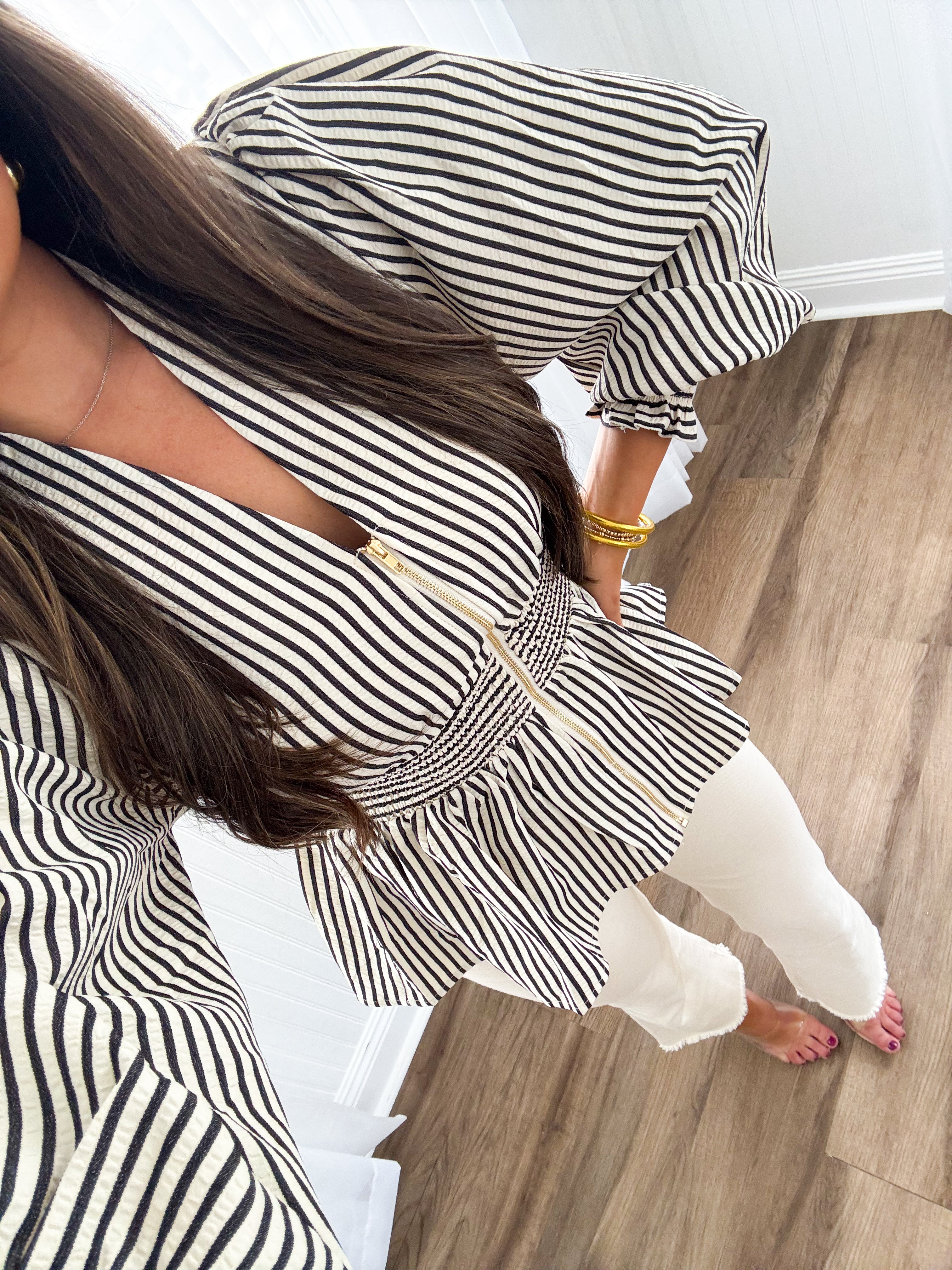Timeless stripes with a modern twist — the So Little Time Striped Top – Black brings effortless sophistication to your everyday style. Featuring vertical black and ivory stripes for a flattering, elongating look, this blouse stands out with its smocked waist that cinches beautifully for a feminine fit. The gold zip-front neckline adds a chic, polished finish, while the peplum hem creates soft movement that’s both classic and on-trend!