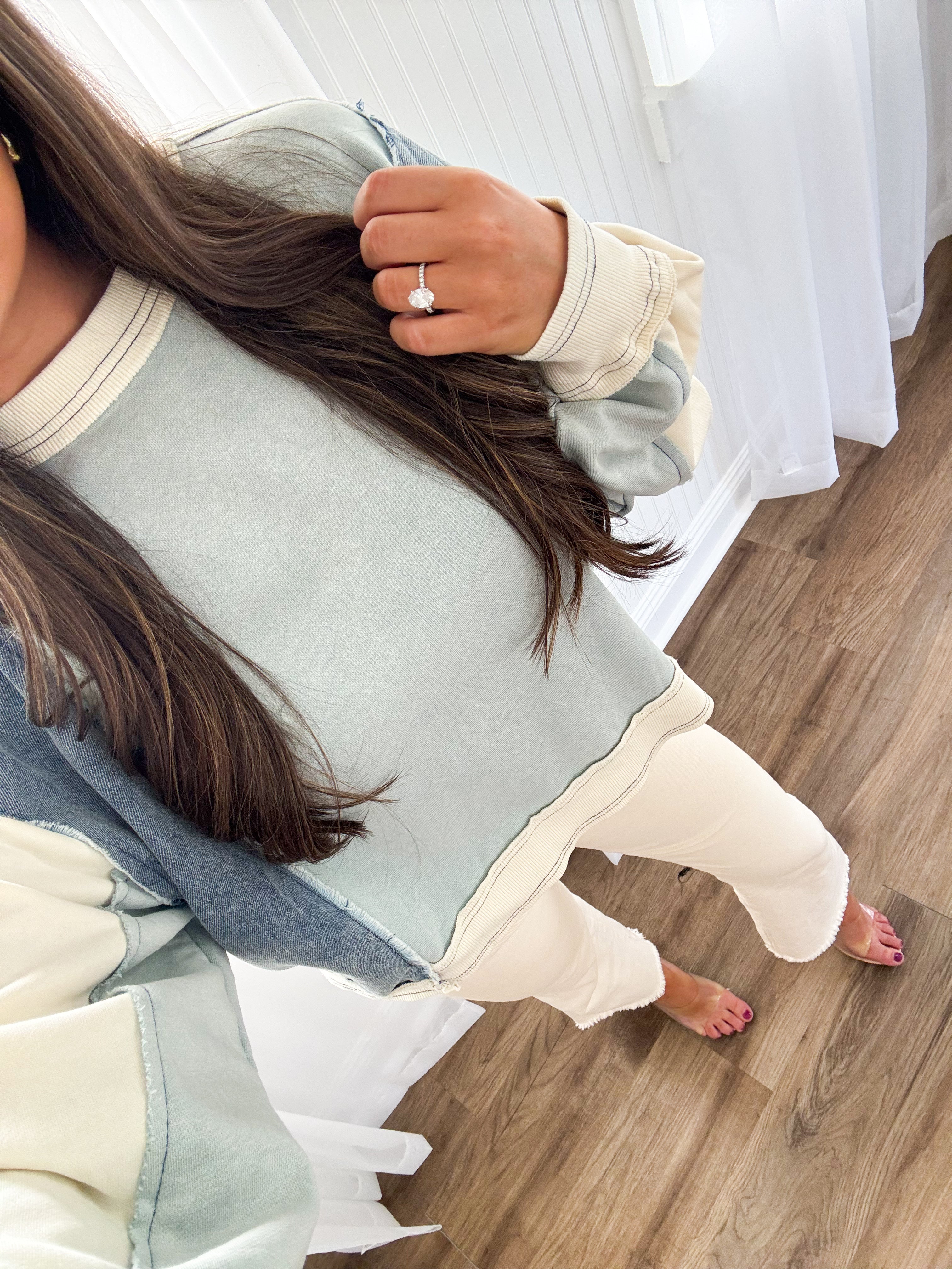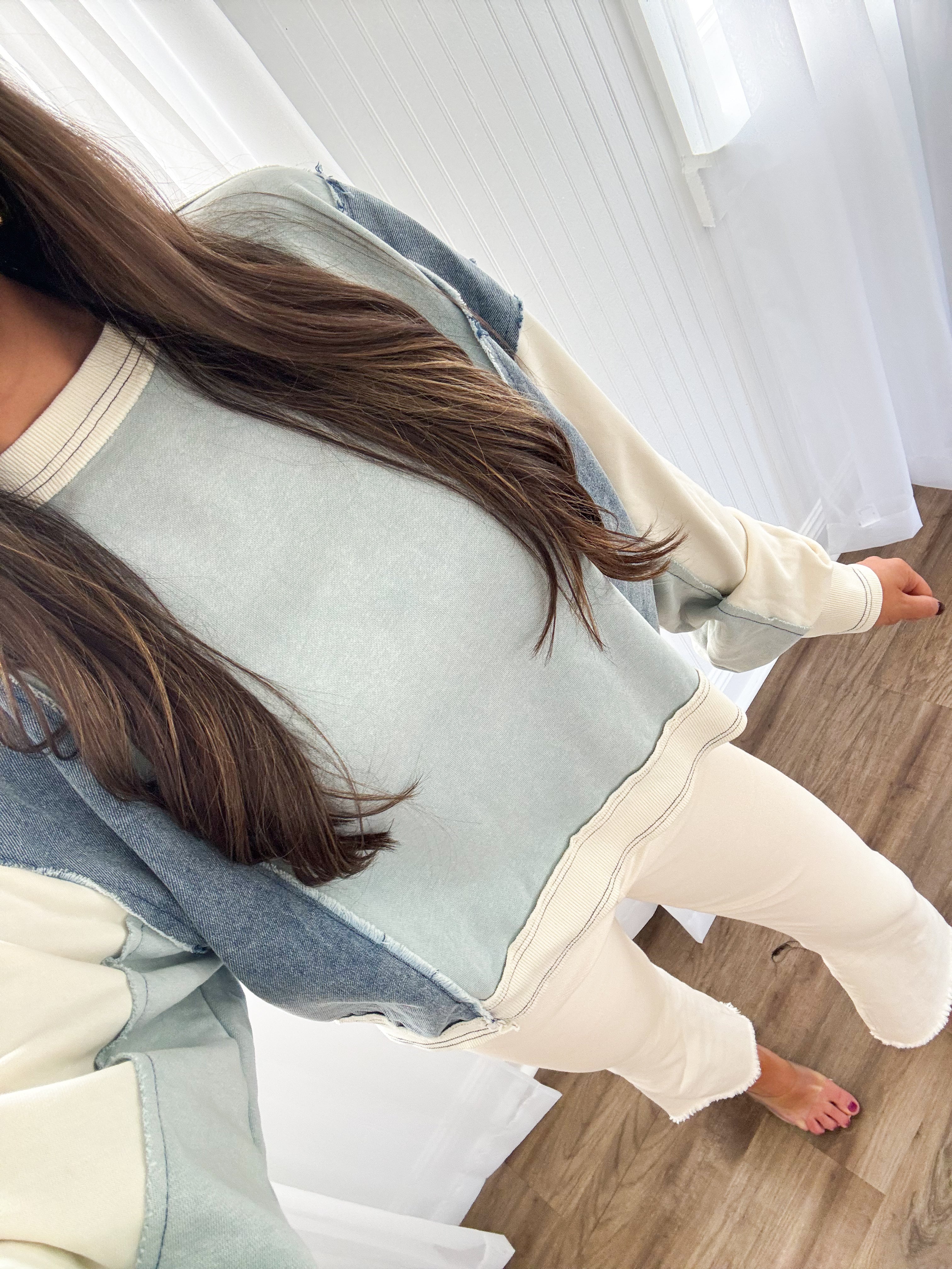 Casual meets cool in the So Long Sage and Denim Top — the ultimate laid-back piece with a stylish twist. This mixed-fabric pullover combines soft sage cotton with denim patchwork accents and creamy contrast trim for a perfectly worn-in, vintage vibe. The relaxed fit and raw-edge seams add just the right amount of edge while keeping things effortlessly comfortable. 53% Cotton, 47% Polyester.