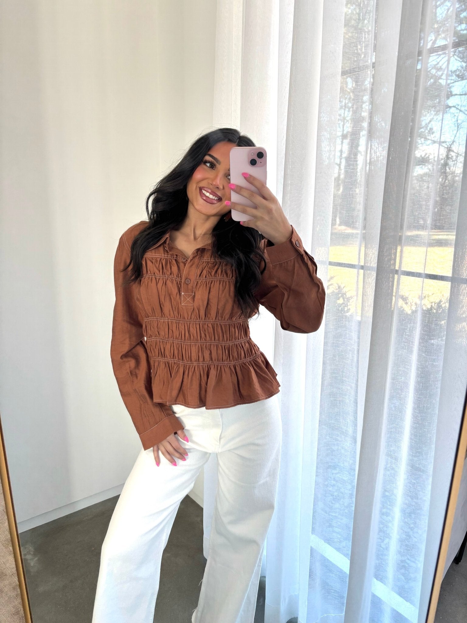 Add a touch of sweetness to your wardrobe with the Sweet Cinnamon Ruched Top — where classic meets cozy in all the right ways!