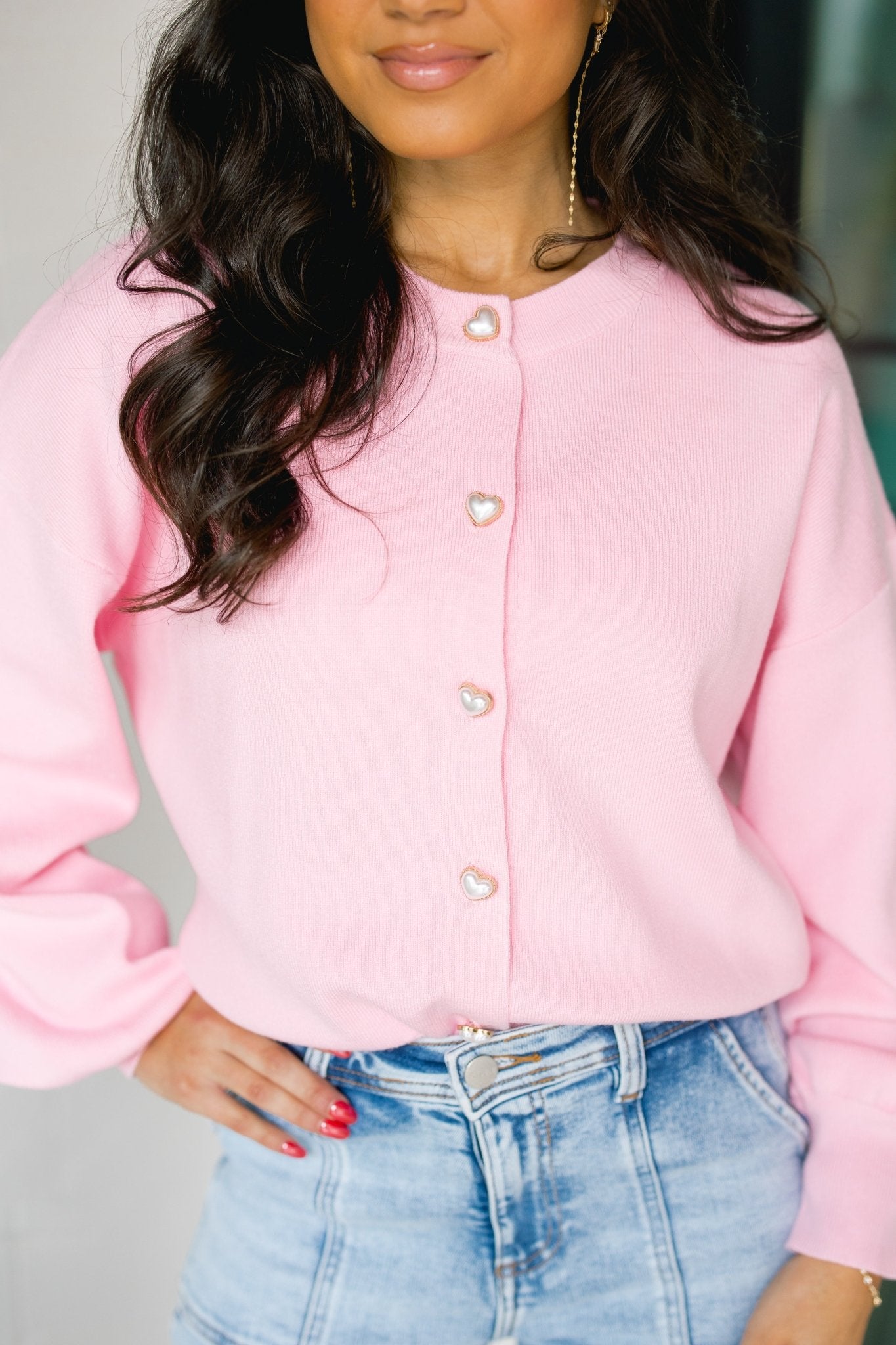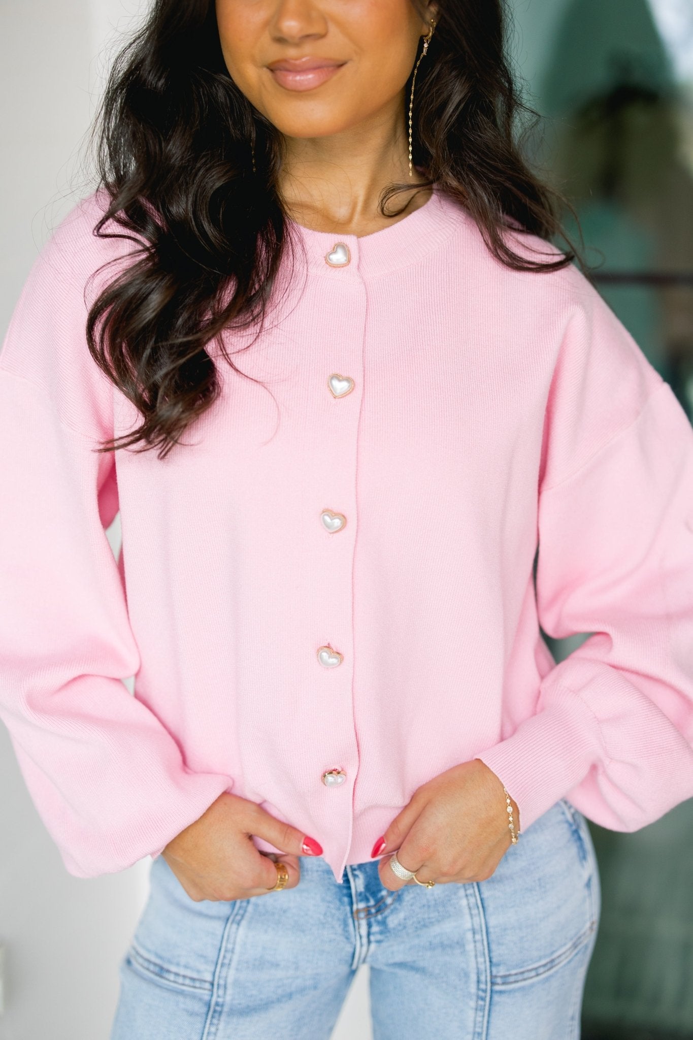 Soft, sweet, and full of charm â the Tell It To My Heart Pink Cardigan is the kind of piece that instantly elevates your everyday look!!! Designed in a dreamy blush pink knit, this cardigan features the prettiest pearl heart buttons down the front for a subtle, romantic touch. The relaxed silhouette with gently puffed sleeves gives it an effortless, polished feel you can dress up or down with ease.