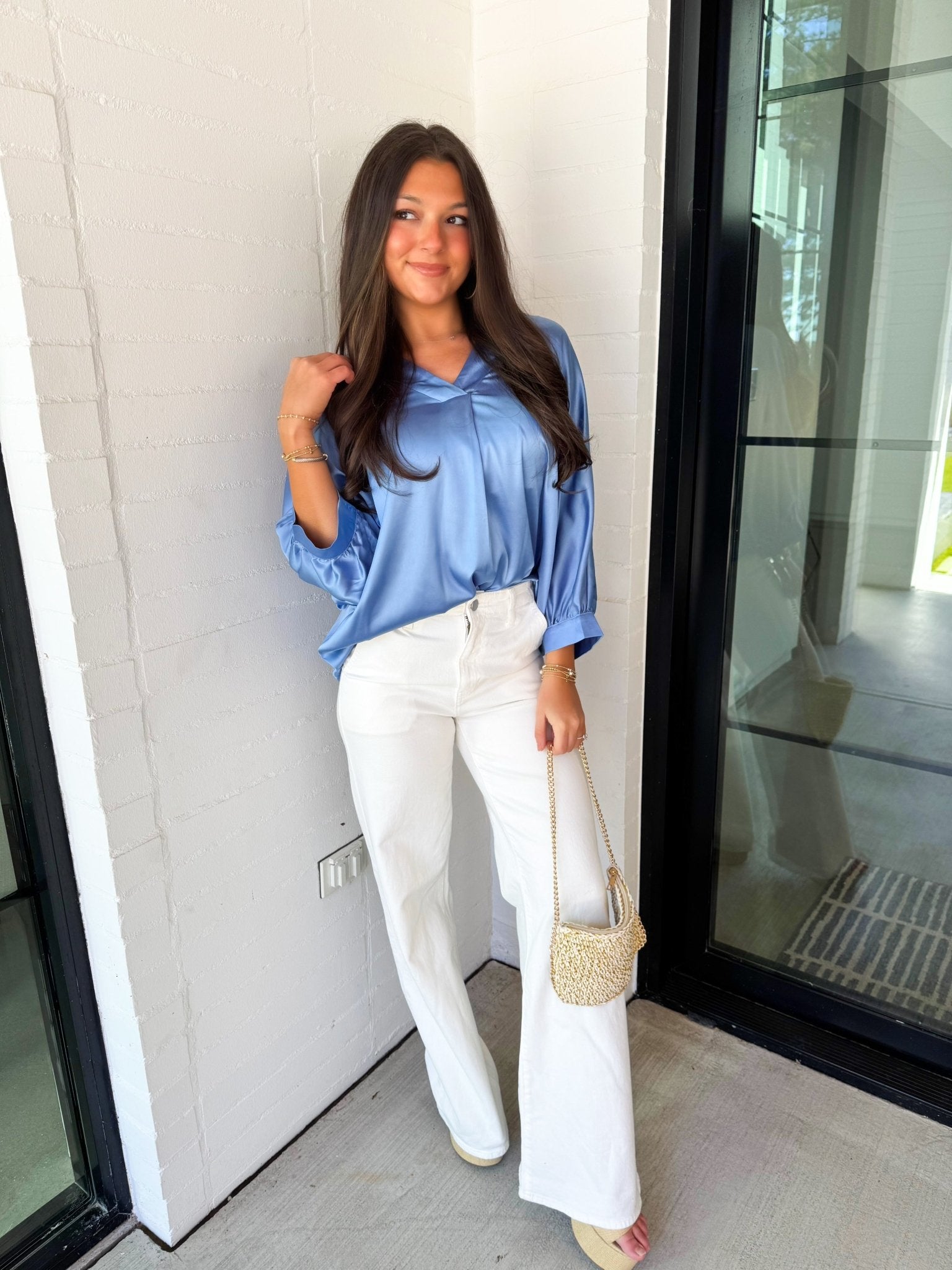 Effortlessly polished with a soft, flowy feel, the Blue Skies Ahead Silky Blouse is the kind of top that instantly elevates your everyday look. Designed in a gorgeous sky-blue hue with a subtle sheen, this blouse drapes beautifully for a flattering, easy fit. The relaxed V-neckline and billowy sleeves add just the right touch of femininity while keeping things comfortable and wearable all day long.