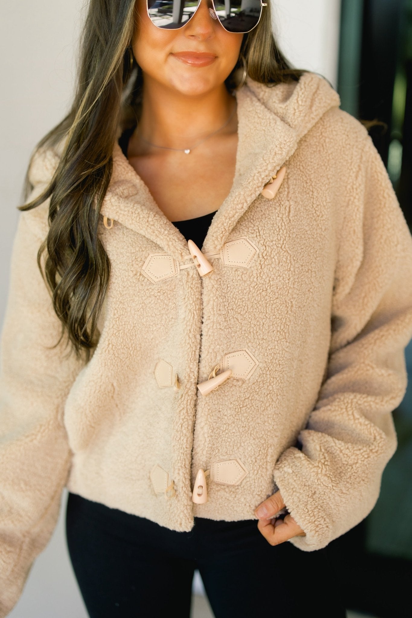 By The Fire Taupe Jacket – Sherpa Toggle Hooded Coat
