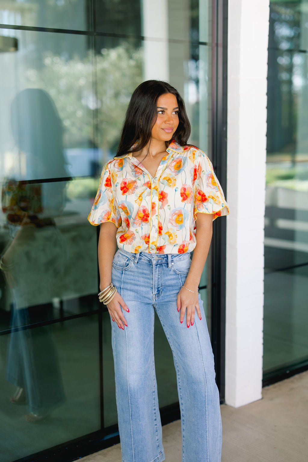 Freshen up your closet with the Call It Like I See It Cream Top, a vibrant floral statement piece that instantly lifts any outfit. Designed with a lightweight cream base and covered in watercolor-style blooms—pinks, corals, golds, and soft blues—this top is full of movement, color, and personality. The button-down front, relaxed silhouette, and subtle piping along the collar give it that perfect blend of playful and polished. 100% Cotton.