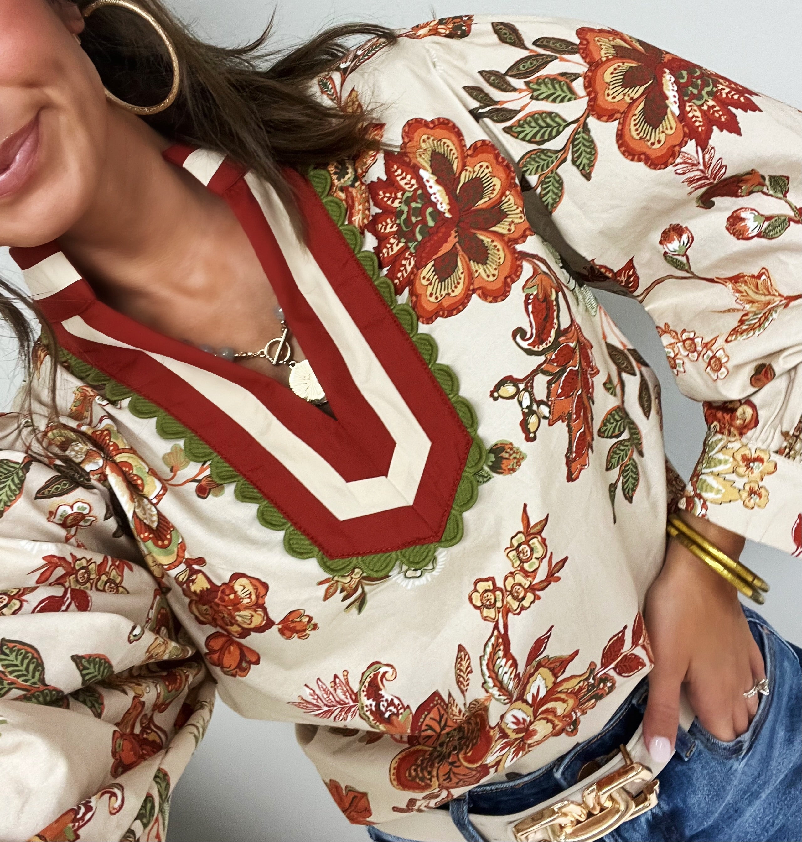 ✨ A floral blouse that feels like fall in full bloom—sophisticated, versatile, and eye-catching.
