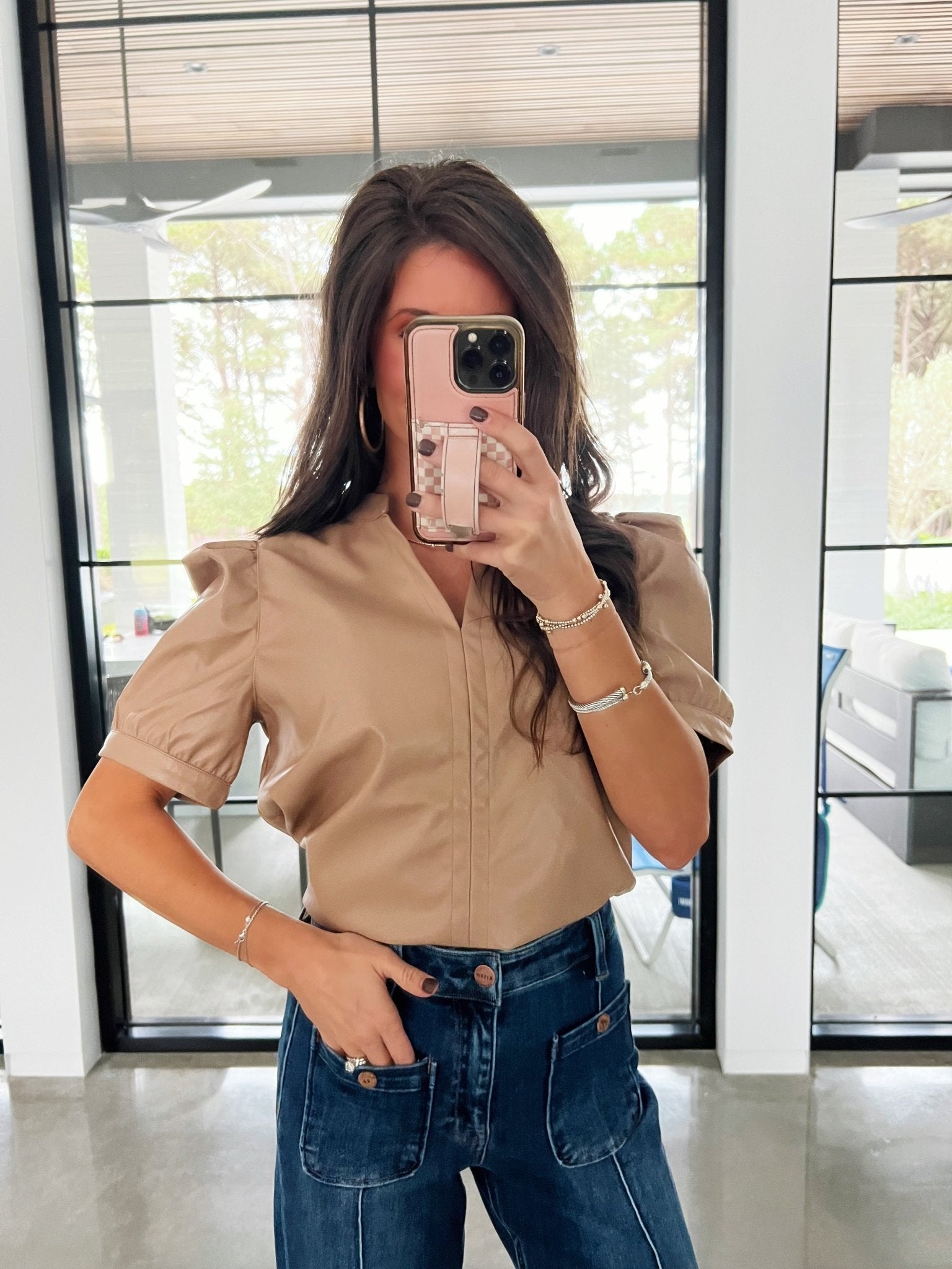 Elevate your look with the Leave Me Here Latte Top, a sleek faux leather piece that perfectly balances edge and elegance. Featuring a soft latte hue and subtle sheen, this top offers a flattering structured fit with gathered puff sleeves and a notched neckline. Whether you pair it with tailored pants or denim, it’s a statement of modern sophistication that transitions seamlessly from day to night! 100% Polyurethane.